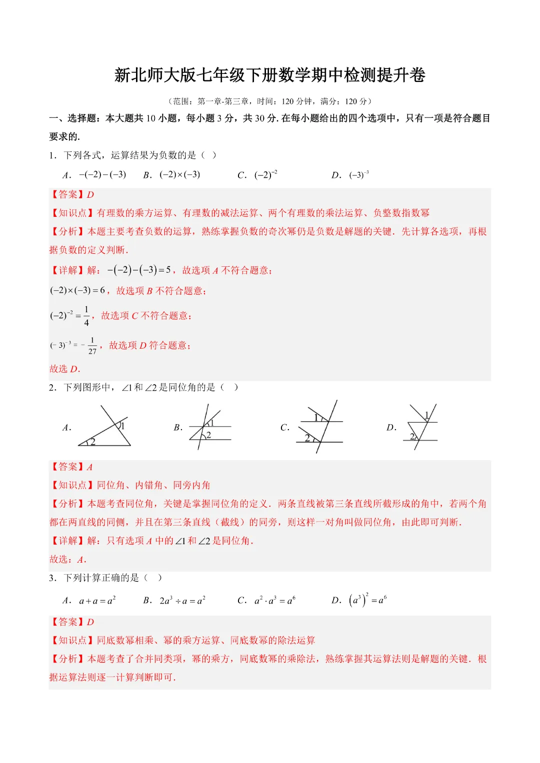 今天给大家分享的是:【26春新版七年级下册数学】【北师大版】期中检测提升卷带答案解析|完整高清电子版可打印