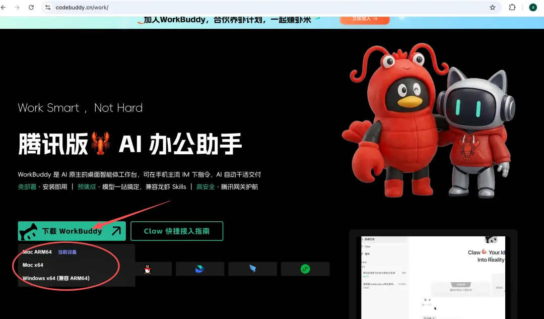 安装很简单,进入这个地址:https://www.codebuddy.cn/work/,直接按照自己的电脑型号下载即可。就是这么简单粗暴,完全不背着我们。