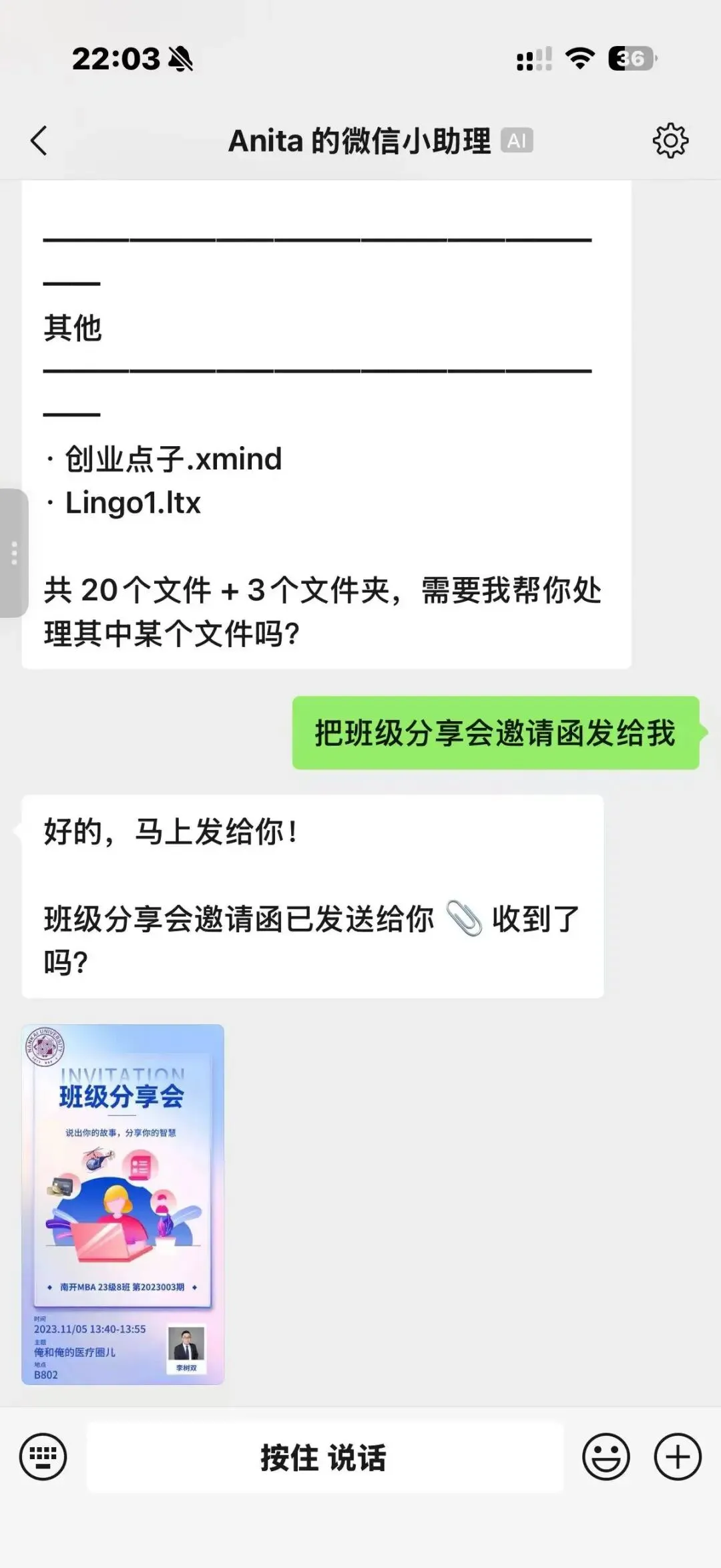 下图演示了我如何通过手机微信,让workbuddy的龙虾助手给我找了电脑桌面上的所有文件,并把其中一个文件发给我。