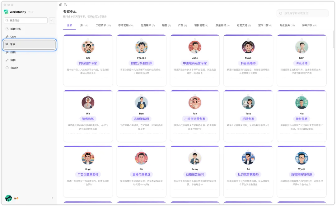 在这里,目前已经上架了各个领域的专家150个,有设计、工程技术、市场营销、销售等各个领域。如果你是1人工作室的老板,你会发现这150个超级员工的技能足够你用。