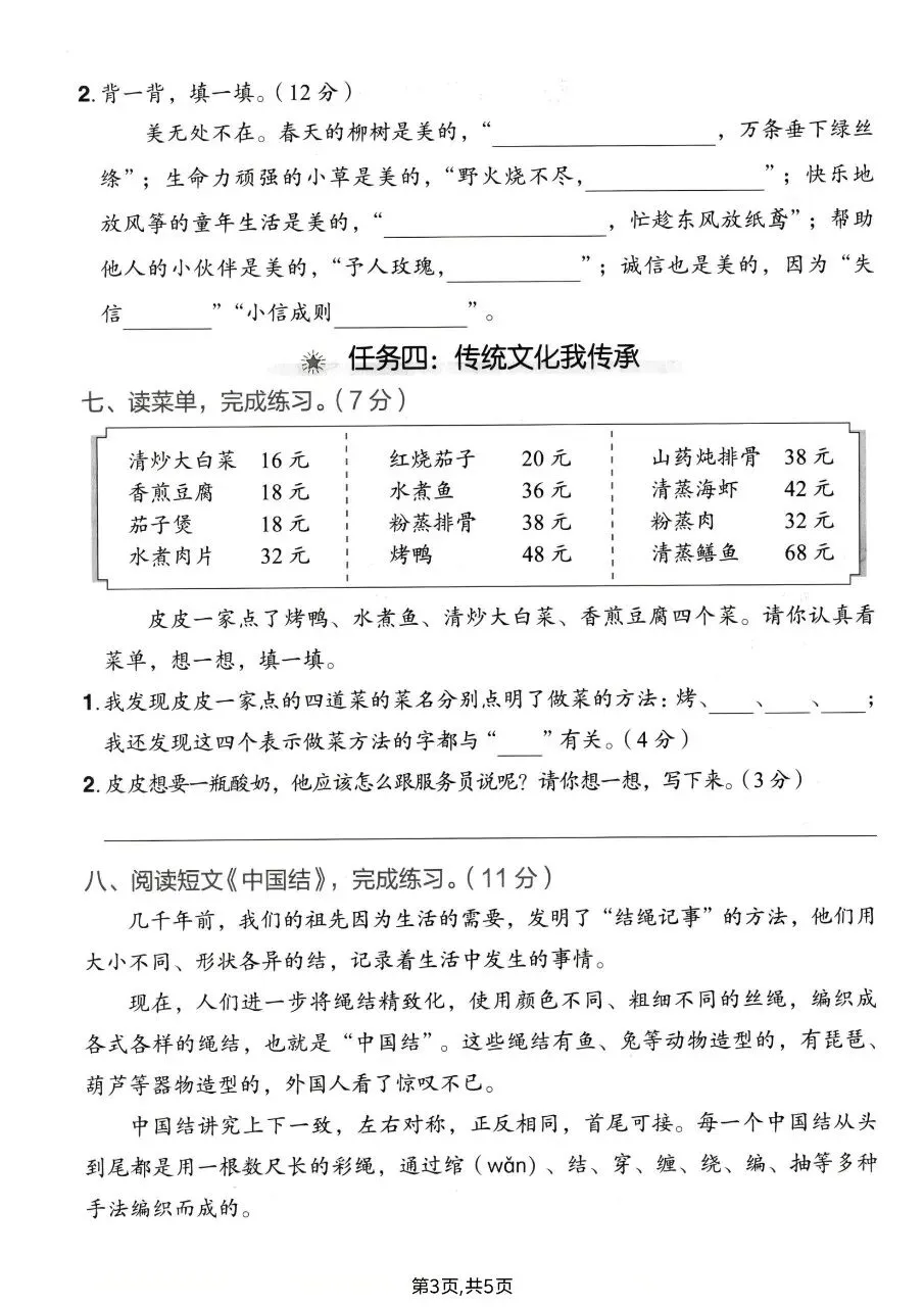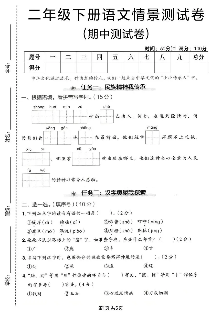 2026年春二年级下册人教版语文期中考试情景测试卷含答案,完整电子版