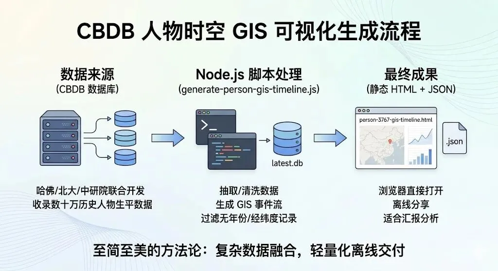 这种架构的底层逻辑是:先把复杂的查询和清洗工作(如过滤无年份/经纬度的记录、修正错误年份、生成路径线)在本地脚本程序中完成,最终输出一个包含结构化 JSON 数据和完整可视化交互的“成品包”。