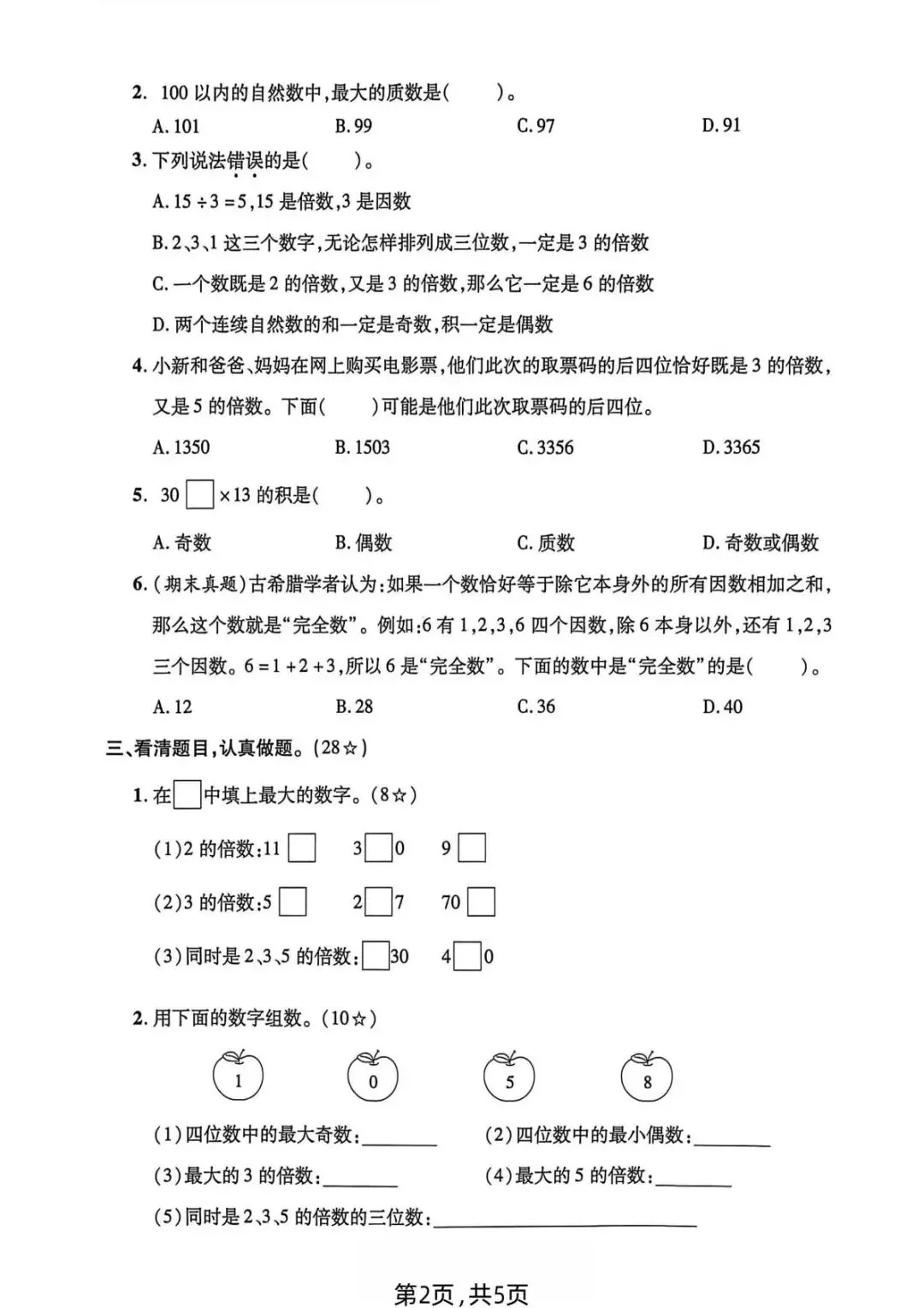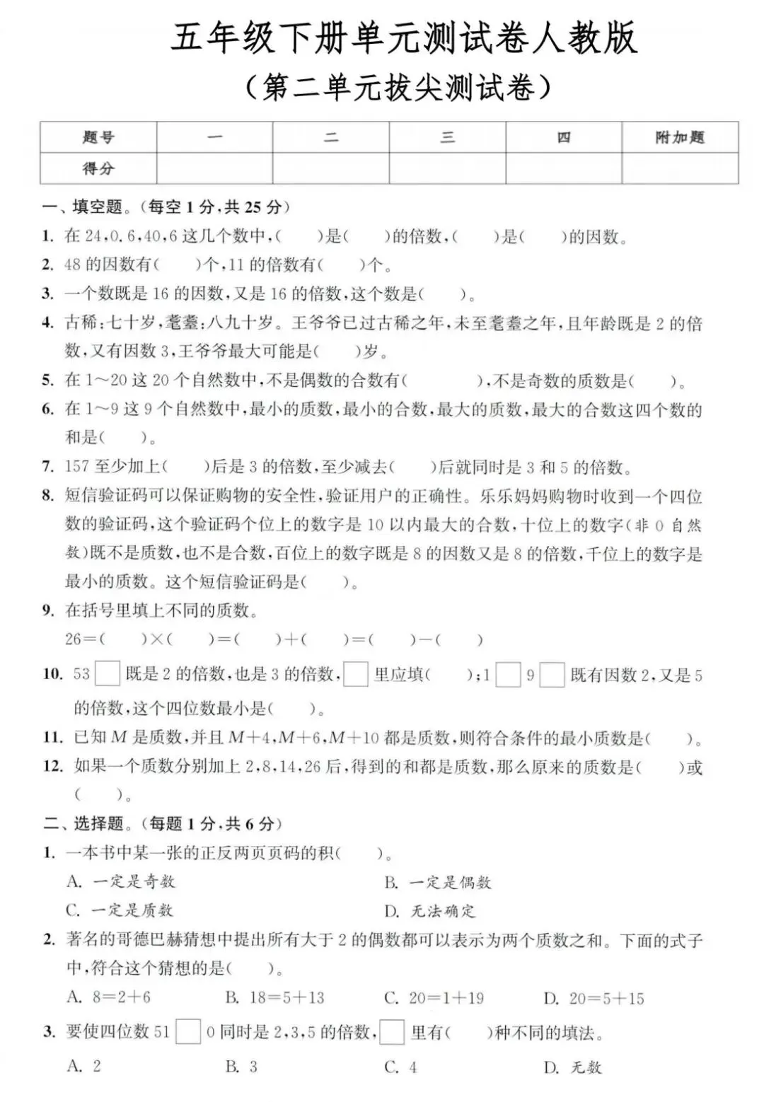 26春五年级语文数学下册第二单元测试卷|电子版可打印