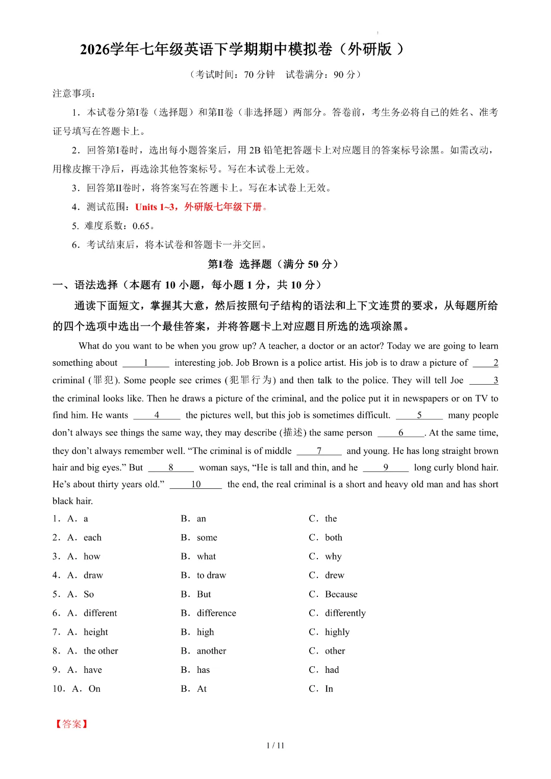 《外研版》2026新七年级(下)英语【期中综合试题】(共17页含答案) 完整可打印
