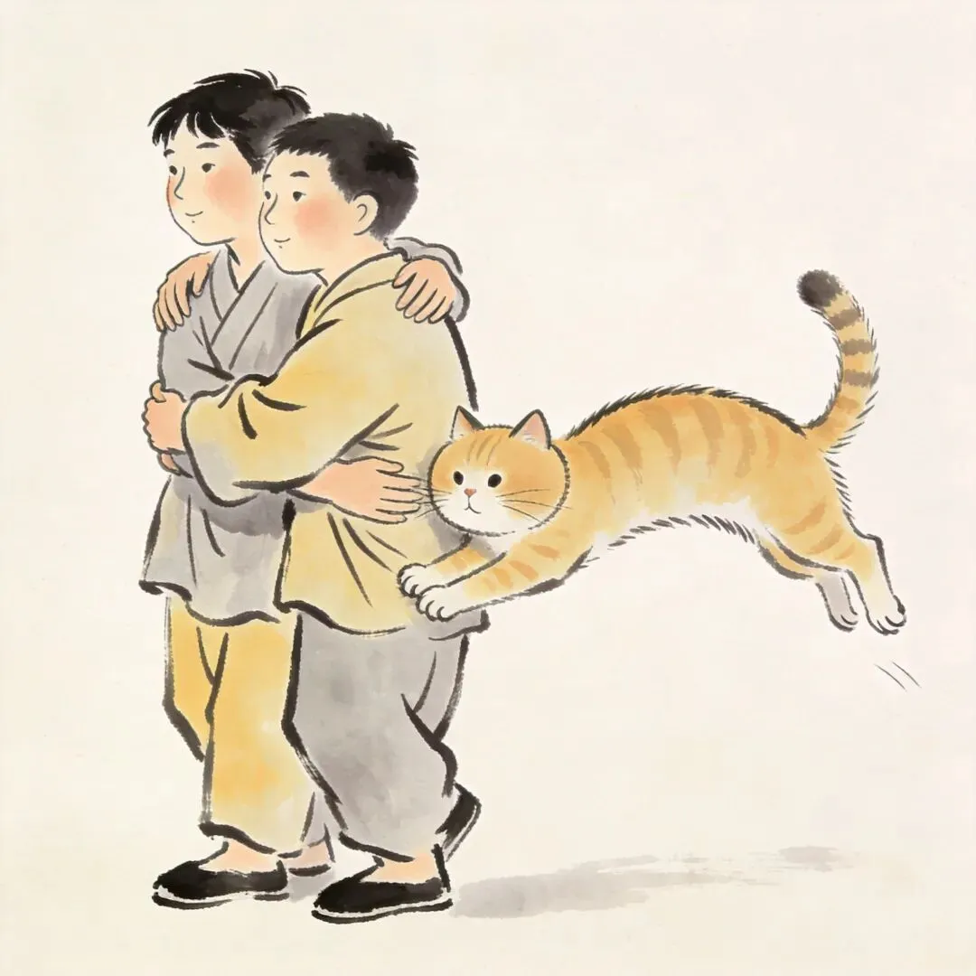你抱了一下朋友,猫从旁边窜过来,硬挤进你们中间。