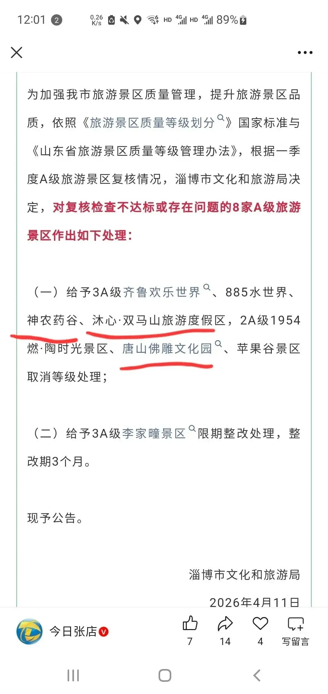 前几天,淄博文旅局取消了八家淄博景区的评级,其中三家是沂源的——神农药谷、沐心双马山景区和唐山佛雕文化园。前几年,沂源牛郎织女景区也被山东省文化厅取消过4A景区。