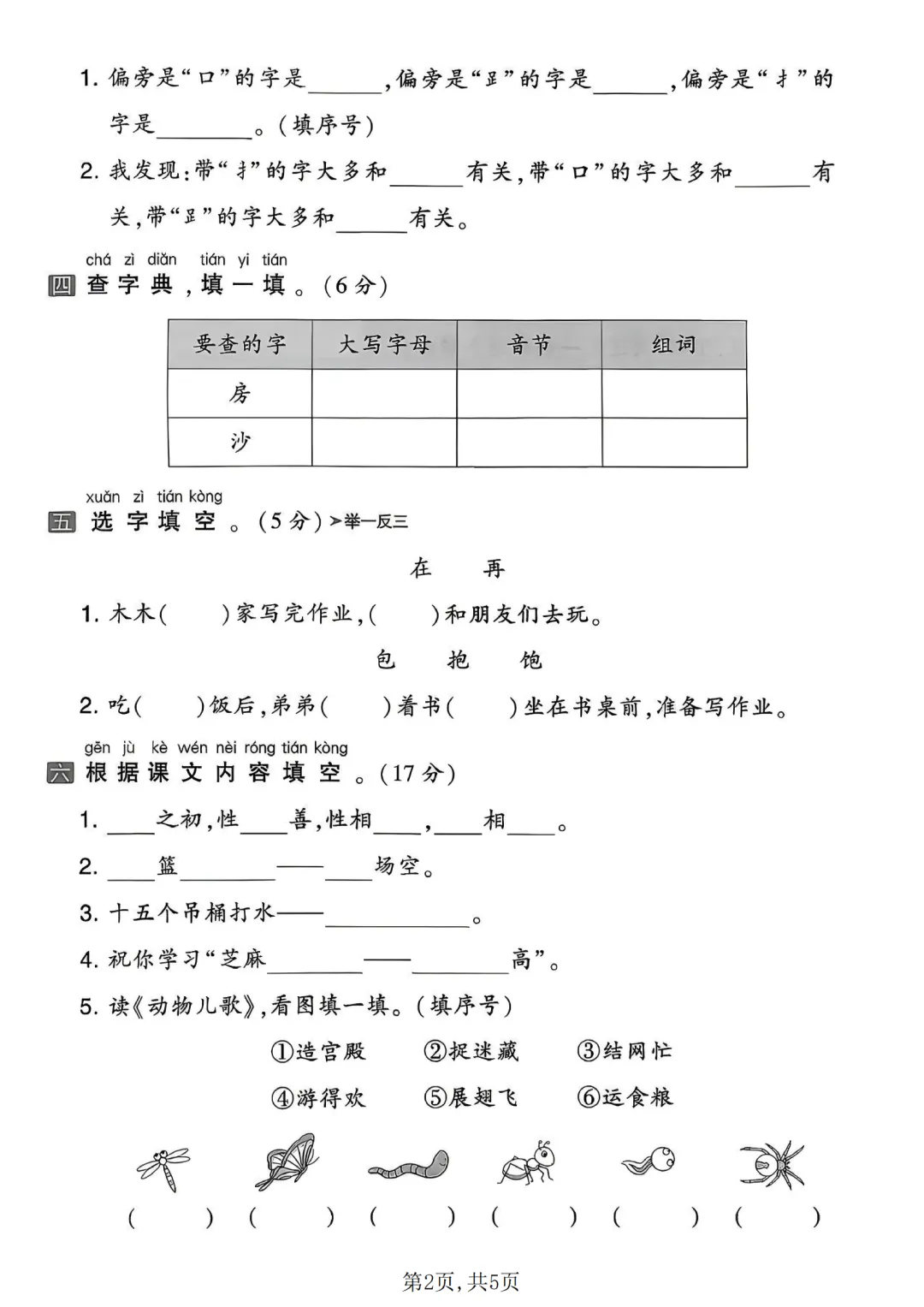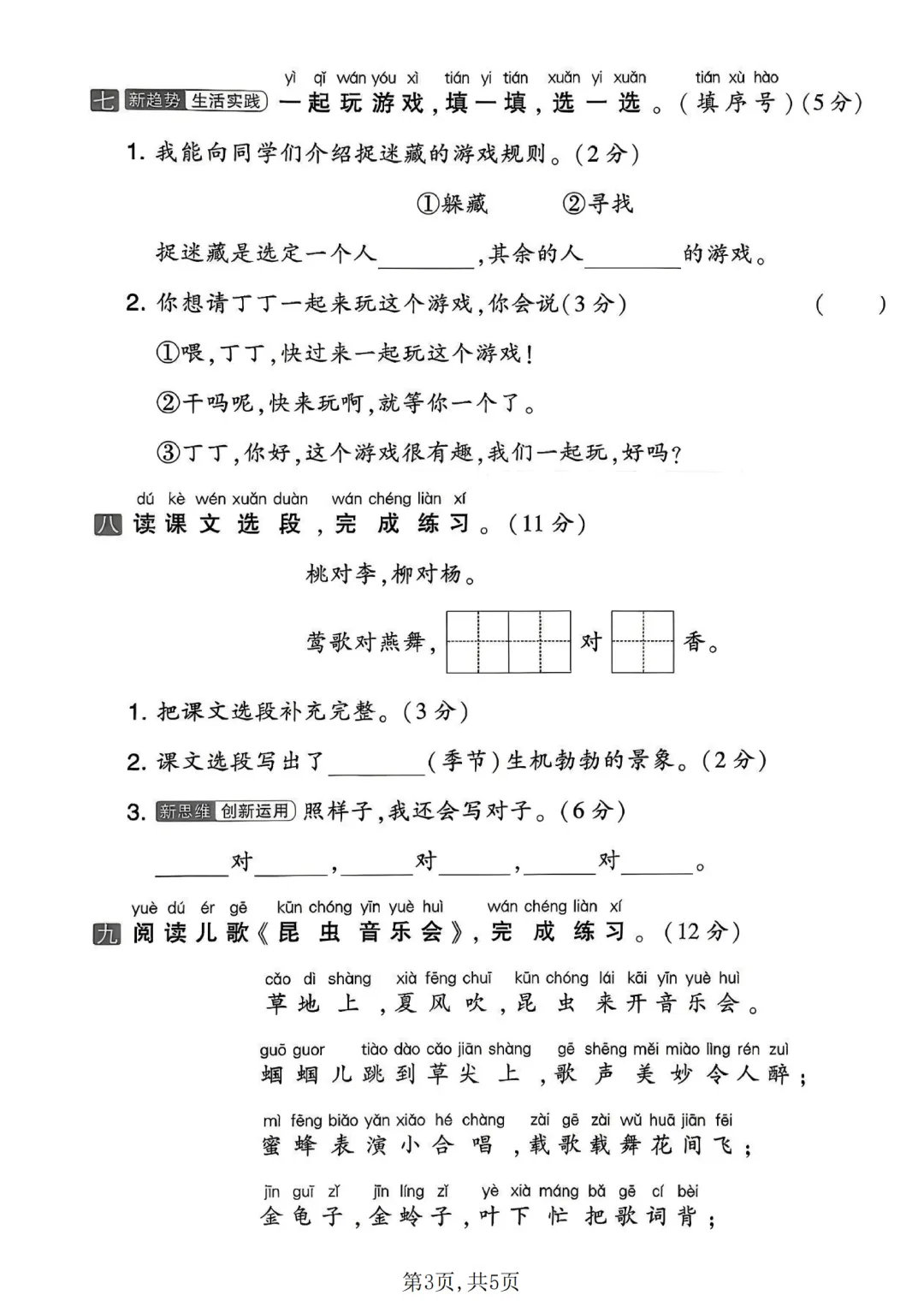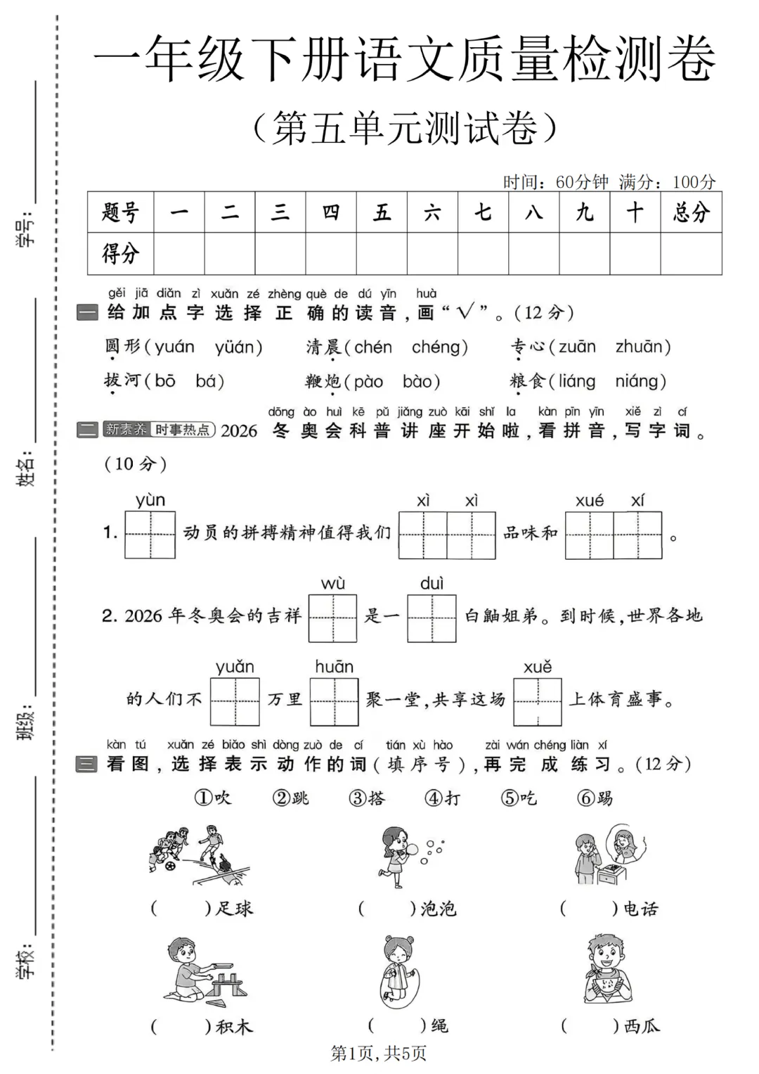【免费下载】一年级(下)语文 第五单元质量检测卷,可打印,PDF电子版