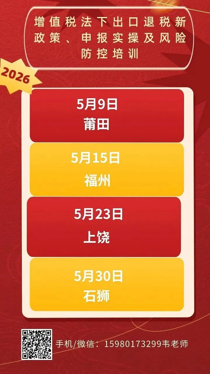 为衔接《增值税法》实施,规范出口业务税收管理、便利企业办税,国家税务总局关于发布《出口业务增值税和消费税退(免)税管理办法》的公告(国家税务总局2026年第5号公告)与财政部 税务总局关于出口业务增值税和消费税政策的公告(财政部、税务总局2026年第11号公告)同步出台,自2026年1月1日起施行。《公告》对出口退税规定作出重大调整。在申报期限、退税备案、收汇管理\备案单证、免税范围\视同内销征税范围、实地核查\函调变化、各类证明申请、实操申报等方面都有较大变化。福州求实税务咨询有限公司是出口退税领域专业培训机构,将于2026年4月18日(星期六)、4月25日(星期六)分别在宁德、龙岩举办“增值税法下出口退税新政策、申报实务操作及风险防控”培训课。培训将聚焦政策核心变化,通过新旧对比清晰拆解差异,结合实操给出企业合规建议,助力出口企业精准把握政策红利、规避涉税风险。现将有关培训的相关事项告知如下: