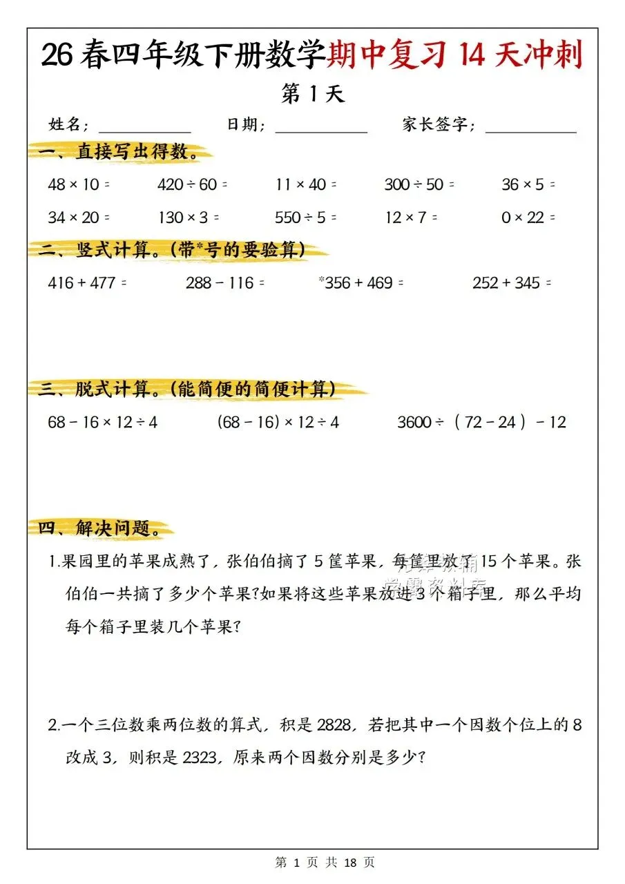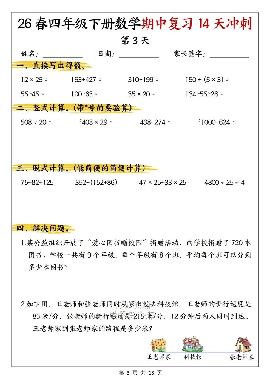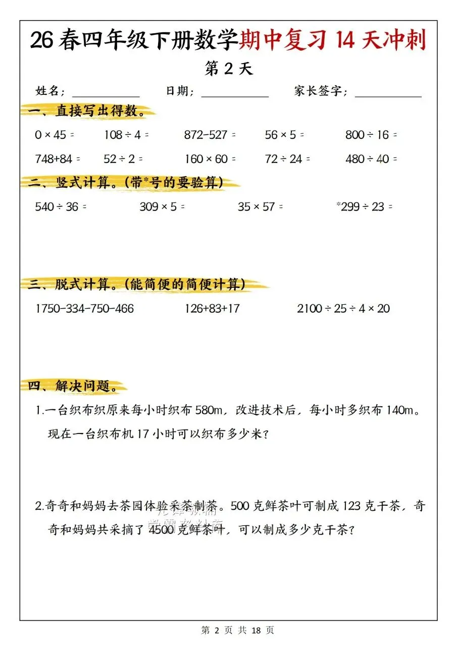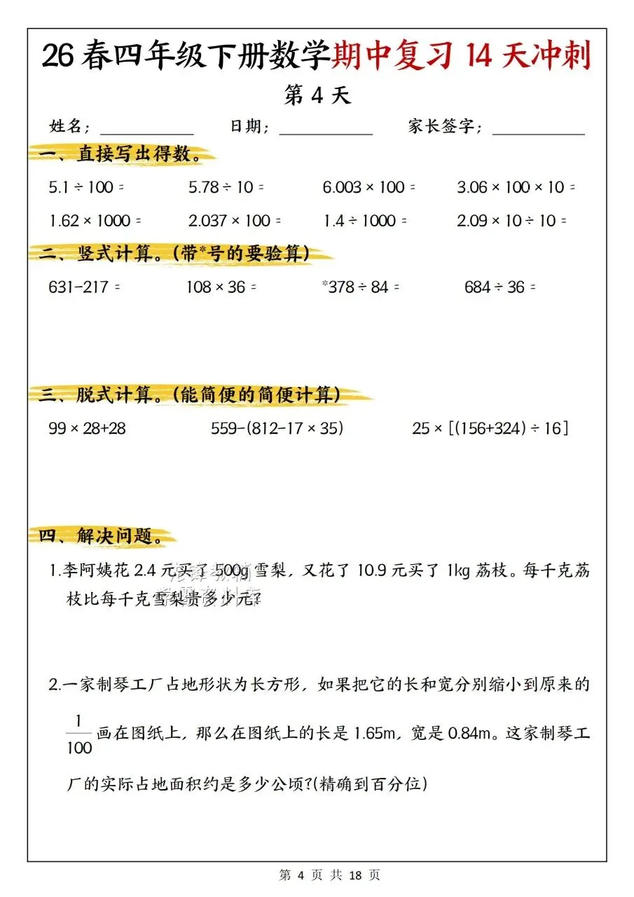 四年级下册数学|期中复习14天冲刺(可下载打印) 小学资料每日更新,具体看完整PDF版本 (温馨提示:文末👇有完整电子版下载🔗) 新版四年级下册数学 期中复习14天冲刺 共18页,每天包含口算、竖式、脱式(简便运算)、解决问题四大题型,核心覆盖四则运算、运算律、小数意义与单位换算、长方形正方形面积、行程与归一归总问题,并附完整参考答案,用于期中考前强化训练。 △因篇幅有限,只展示部分资料截图△ ↓↓↓ 领取完整电子版: ①:点一点右下角的“👍”和“❤️”,感谢🙏 ②:在公众号对话框回复:1065 资料合集:👇👇 小学学习方法 四年级下册语文 四年级下册英语
