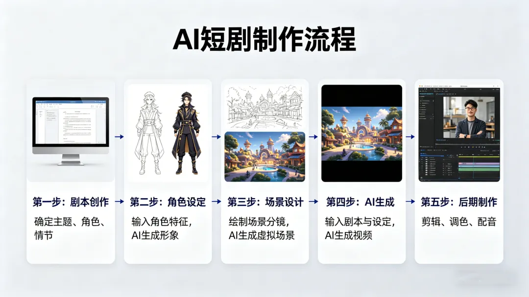 整个创作过程无需专业技能,跟着步骤走,1人就能完成整个剧组的工作,具体流程如下: