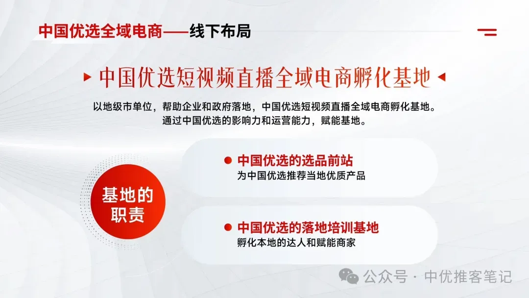 中国优选全域电商——线下布局以地级市为单位,中国优选打造短视频直播全域电商孵化基地,通过自身影响力和运营能力,赋能基地:• 作为选品前站,推荐当地优质产品;• 作为落地培训基地,孵化本地的达人和赋能商家。中国优选,既要讲好中国故事,也要卖好中国产品。它以微信视频号为核心平台,打造多元经营矩阵,实现公域流量、私域流量平台覆盖式发展,铸造品牌特性。
