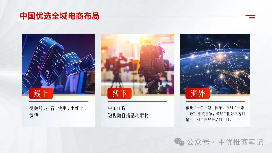 中国优选全域电商布局• 线上:视频号、抖音、快手、小红书、微博;• 线下:短视频直播孵化基地;• 海外:依托“一带一路”,布局相关国家,做好中国好内容的输出和中国好产品的出口。中国优选在“方式”上选择了“全域电商”,从线上、到线下、再到海外,我们现在看到的,只是冰山一角。
