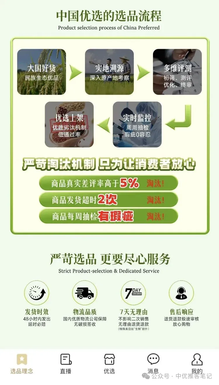 推客最怕什么?选到假货、次品,赚了佣金丢了粉丝信任。但中国优选在供应链上,直接把“门槛”拉到最高。它的商品来源只有两个“硬渠道”:• 要么是经商务部、省市政府背书的产销对接大会推荐,自带官方认证;• 要么是源头厂商自荐,但必须经过实地考察、多方对比,不是随便想进就能进。