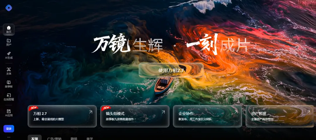 打开它的网站,一眼就能看到它顶部的【万镜生辉·一刻成片】板块,还搭载了全新的万相2.7大模型。中间则分布着【万相2.7】、【镜头组模式】、【企业协作】、【资产管理】四大入口。下方则整齐排列着【发现】、【广告/营销】、【剧场】、【美学】四个小模块。不管你是个人随手记录灵感,还是团队需要批量产出内容,都能快速找到对应的功能区域,再也不用对着复杂无比的界面茫然摸索了,这设计,实在是太贴心了。