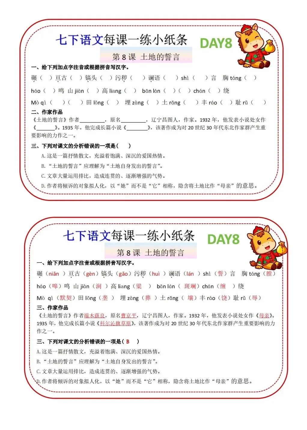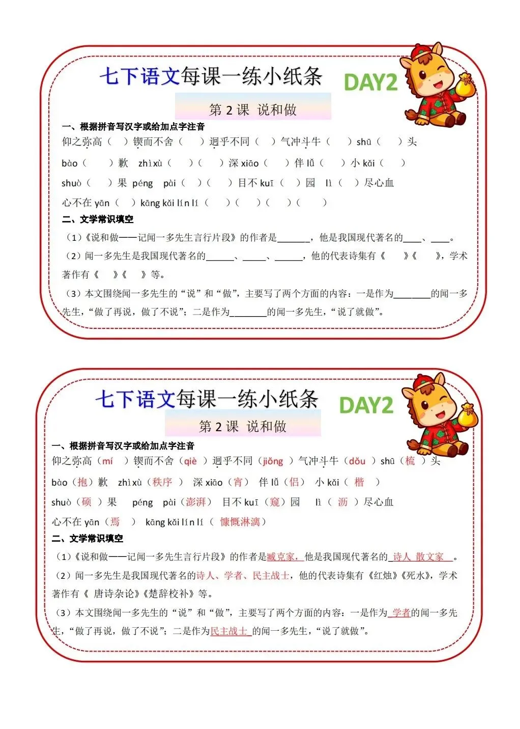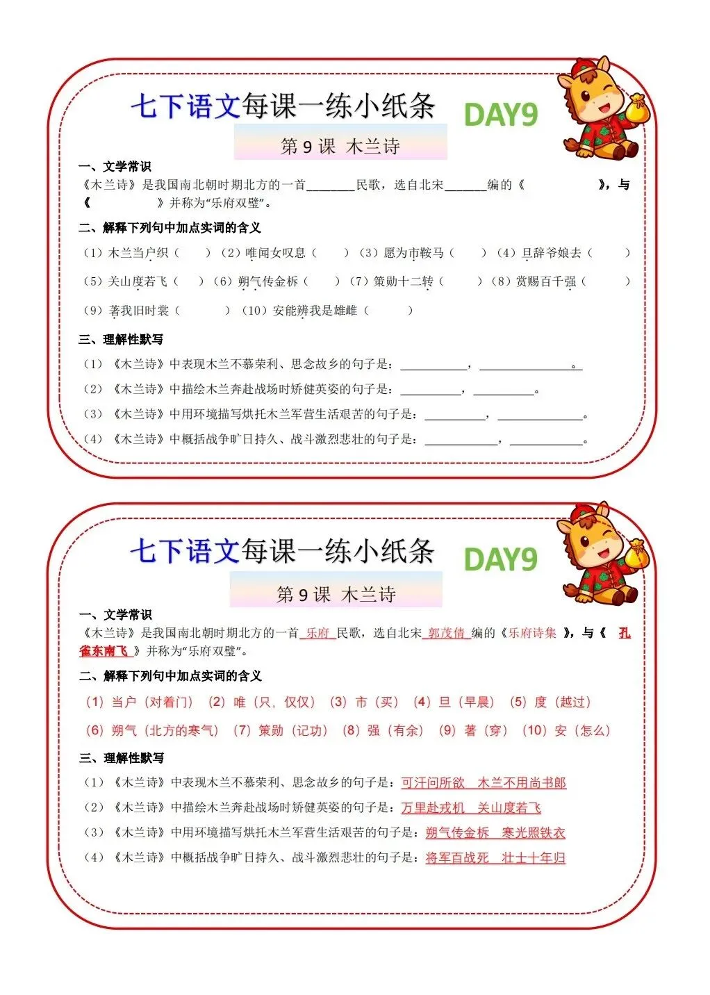 2026版七年级下册语文每课一练小纸条,可打印电子版!