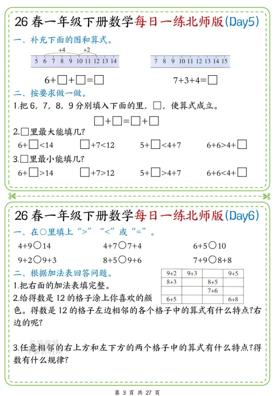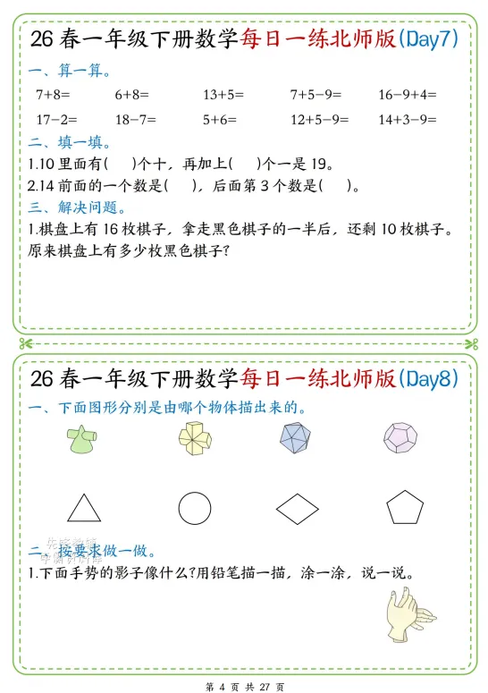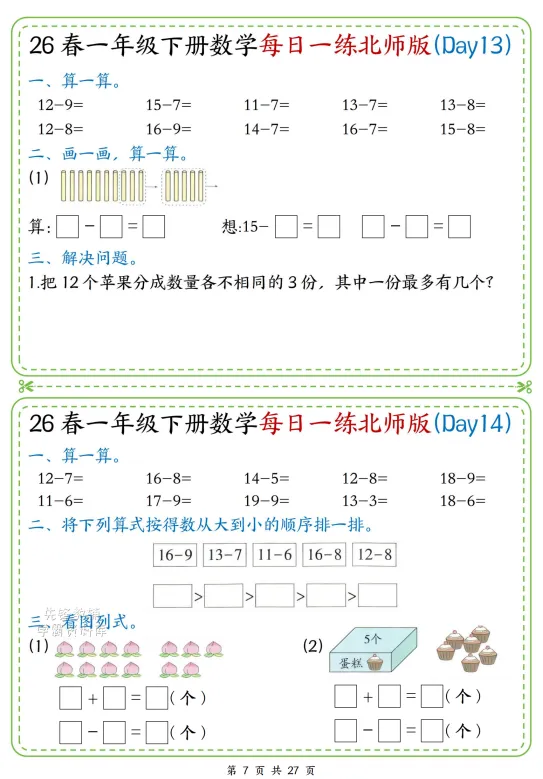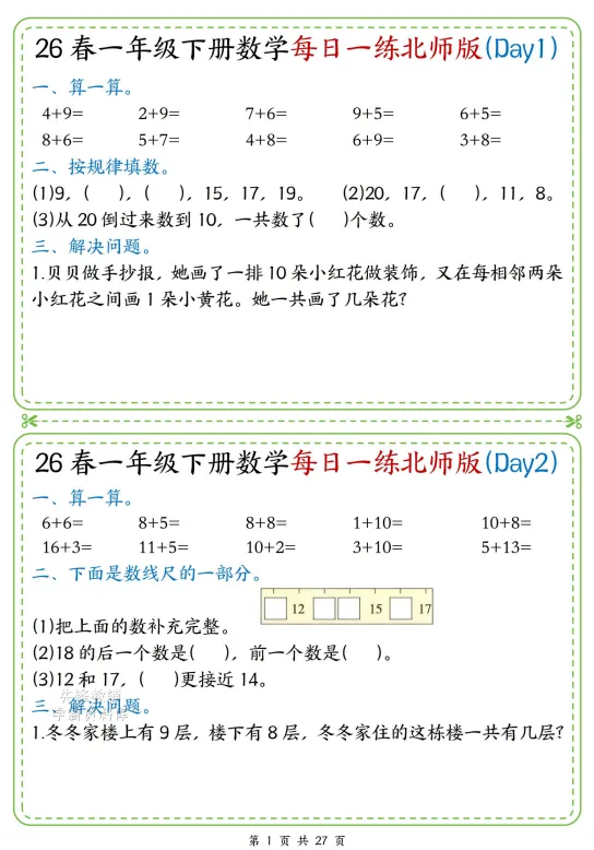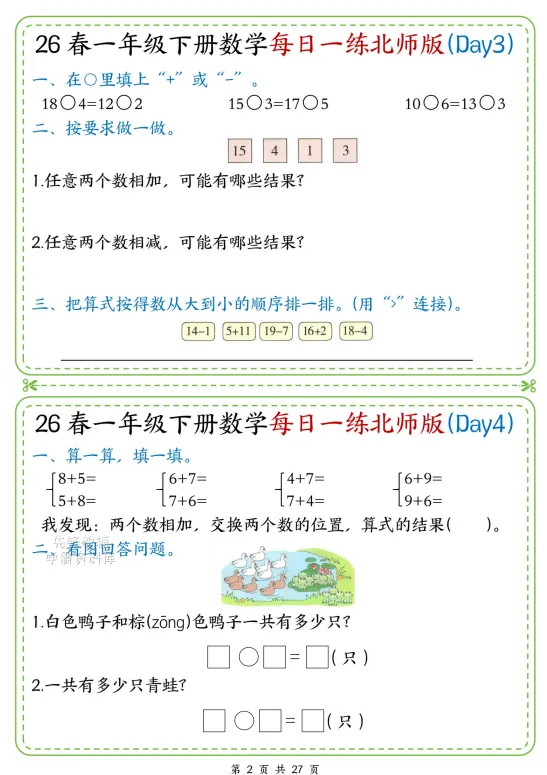 26(新版) 一年级(下)数学每日一练《北师版》共27页含答案完整版,电子版高清可下载可打印。因篇幅有限,仅展示部分内容。有需要的家长快给孩子领取一份,让孩子练习吧!