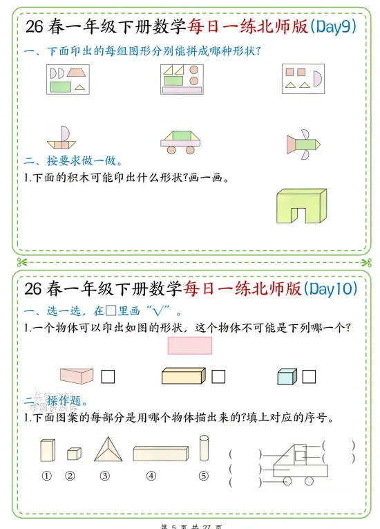 新版一年级(下)数学每日一练《北师版》电子版可打印可下载