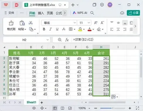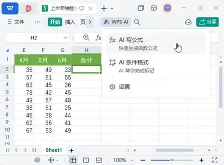 Step01:打开“素材文件\第8章\上半年销售情况.xlsx”工作簿,选中H2单元格;单击【WPS AI】下拉按钮;在弹出的下拉菜单中单击【AI写公式】命令,如图1所示。