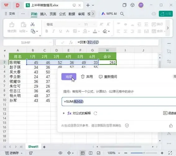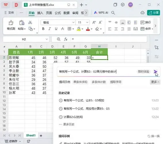 Step02:打开WPS AI窗口,在文本框中提出问题;例如“帮我写一个公式,计算B2:G2单元格中的合计”;单击【发送】按钮,如图2所示。