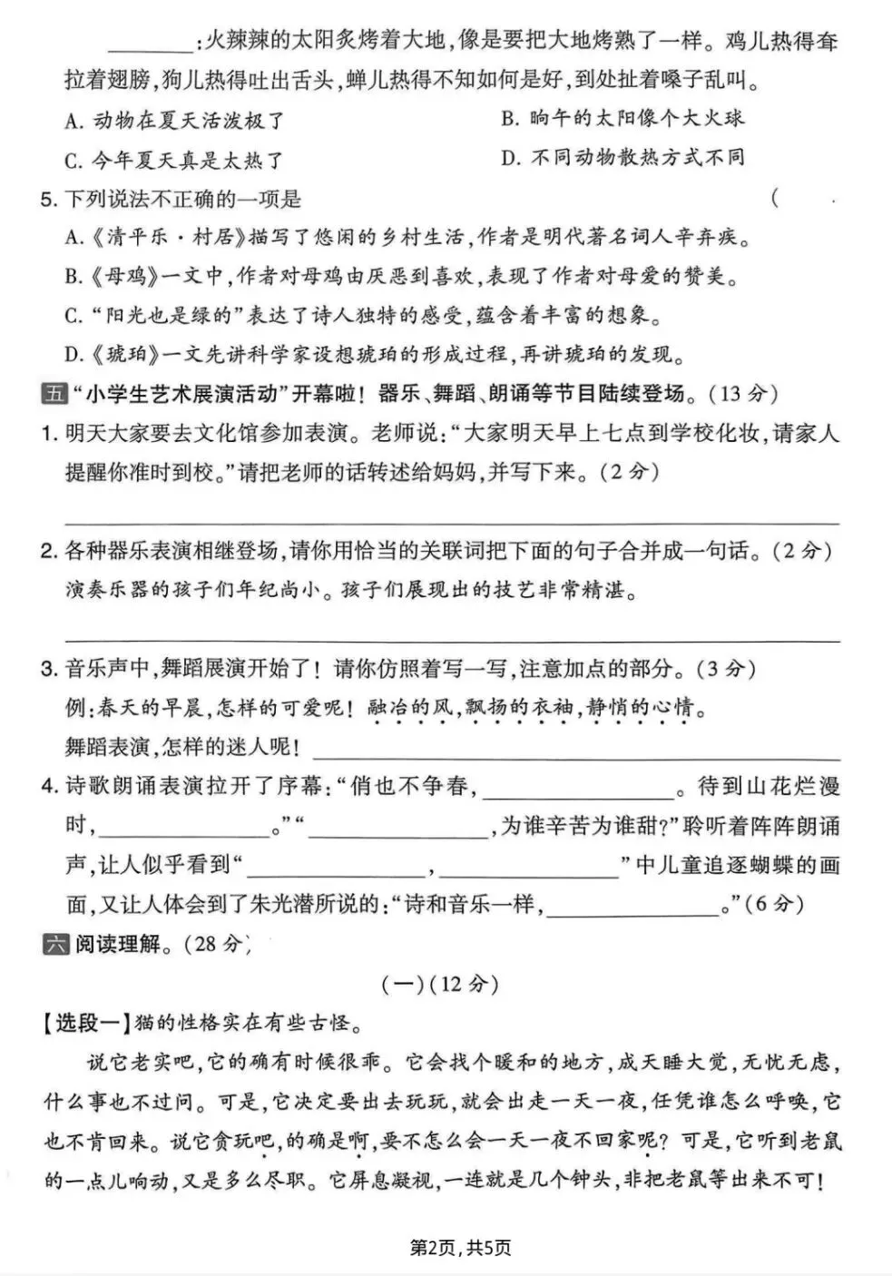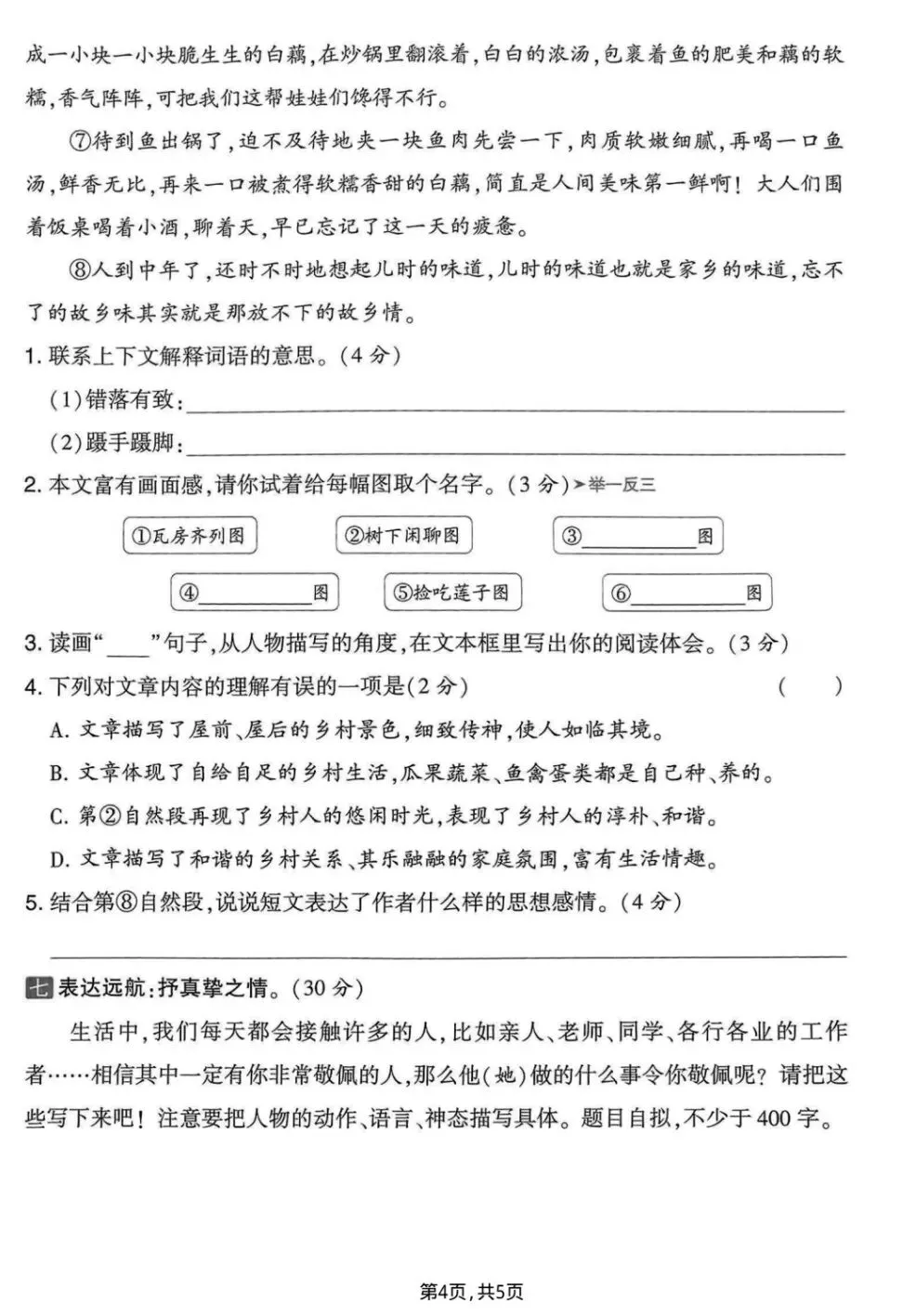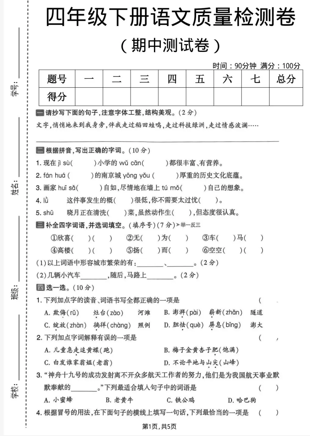 四年级下册语文《期中质量测试卷》多套 电子版可下载打印
