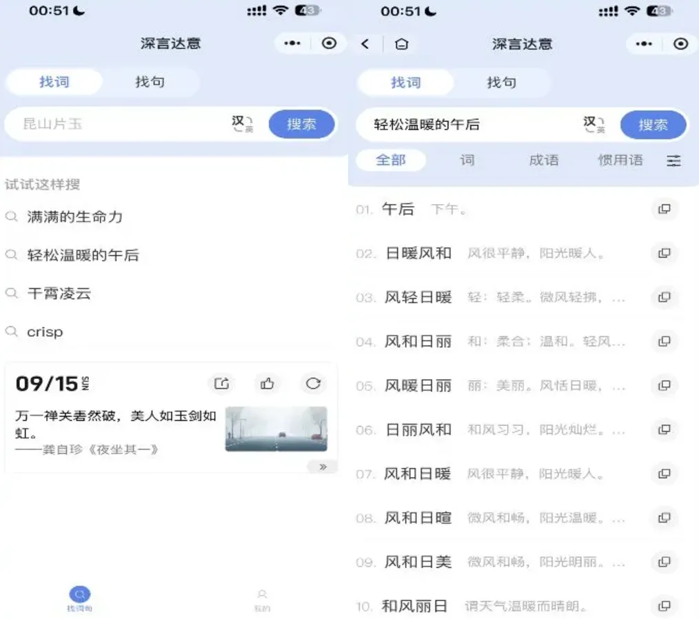 深言达意是原据意查询,现在是小程序了,可根据描述,把一句普通的话修饰成美妙华丽的句子。