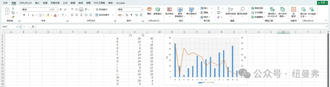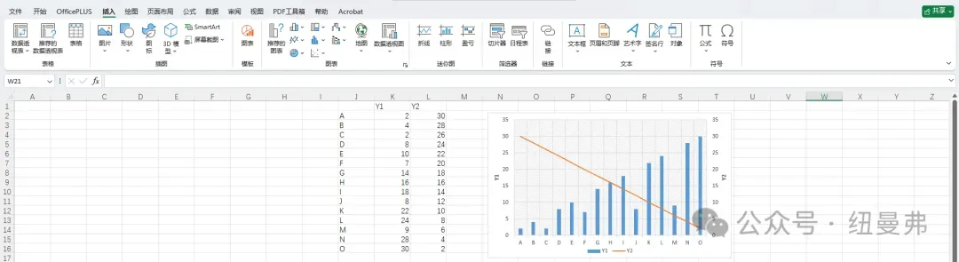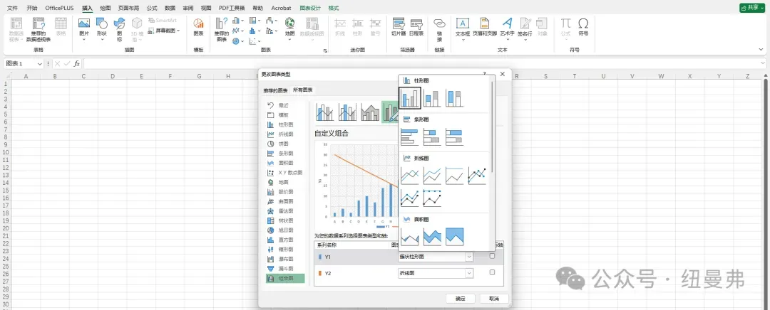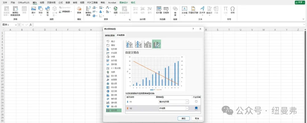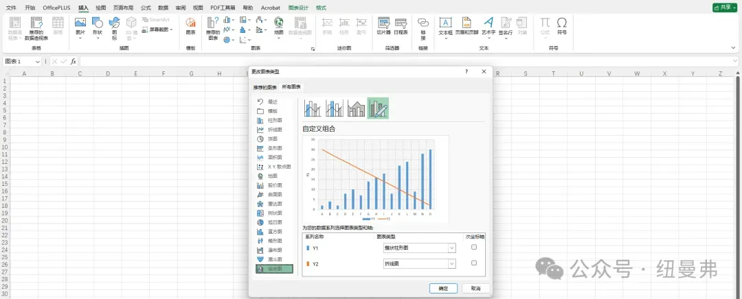 Excel建立组合图模板 首先新建一个Excel文档,在Excel中建立组合图模板 第二步,选择数据后,点击插入推荐图表,选择所有图表 第三步,选择图表类型和次坐标 第四步,选定后生成图表 第五步,选择喜欢的图表类型 组合图表模板建立好了,后期数据输入后图表自动生成 Excel技能+1,牛马减负,开心+999! 加油~