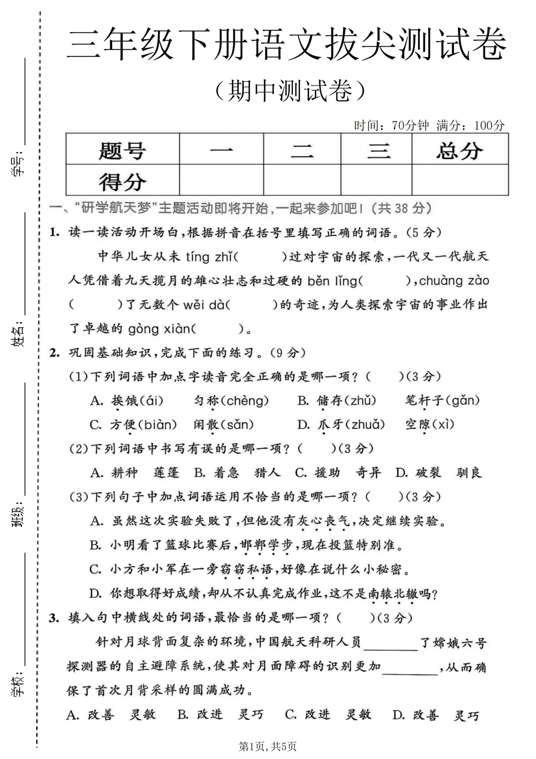 2026年春三年级下册语文部统版《期中测试卷》共四套含答案,完整可打印.