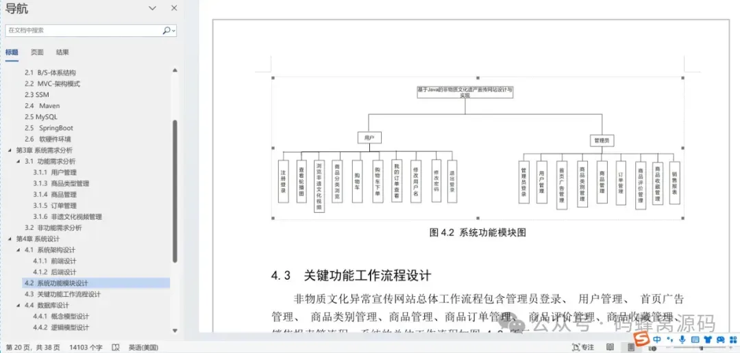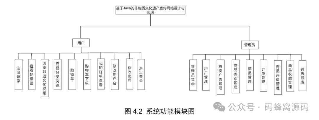 根据系统分析,管理员登录、 用户管理、 首页广告管理、 商品类别管理、商品管理、商品订单管理、 商品评价管理、商品收藏管理、销售报表、非遗文化视频管理等模块。整个系统的功能模块设计如图所示: