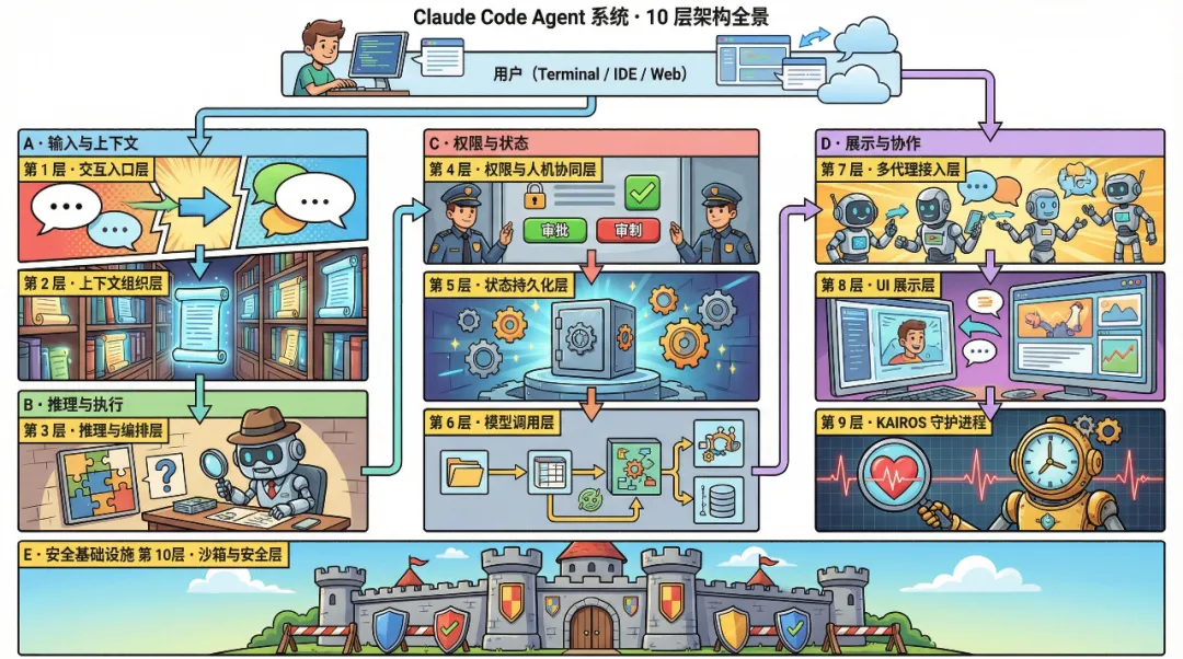 Claude Code 是 Anthropic 于 2024 年推出的 AI 驱动命令行编程助手,基于 Claude 3.5 Sonnet、Claude Opus 4.5 等核心模型构建,核心定位是「AI 软件工程师助手」,区别于传统代码补全工具,其具备项目文件分析、跨文件重构、多工具协同等端到端开发能力,甚至可承担复合开发角色。本文将从源码架构、运行原理、高级特性三个核心维度,结合其技术设计逻辑与实际应用场景,进行系统性解析。 一个完整的 Agent 系统,不只是”模型 + 工具”。Claude Code 可以拆成 10 层: