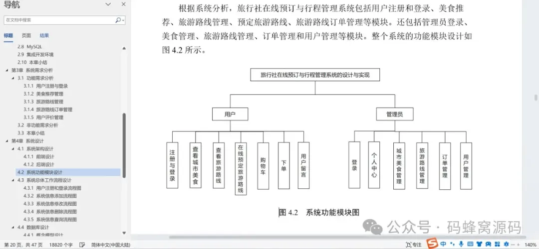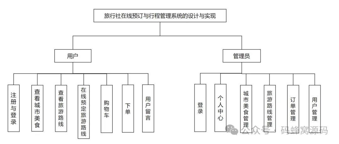旅行社在线预订与行程管理系统包括用户注册和登录、美食推荐、旅游路线管理、预定旅游路线、旅游路线订单管理等模块。还包括管理员登录、美食管理、旅游路线管理、订单管理和用户管理等模块。整个系统的功能模块设计如图 :