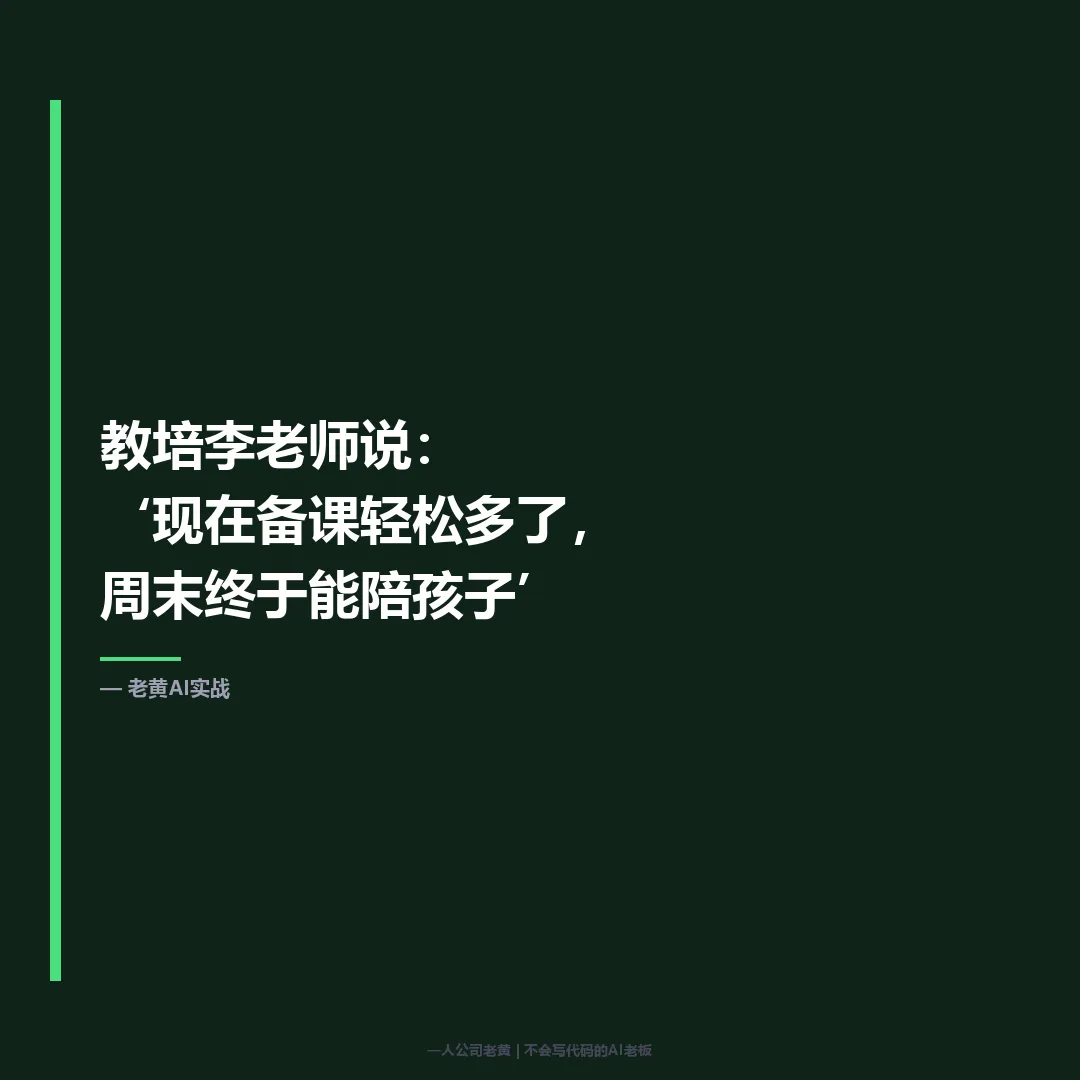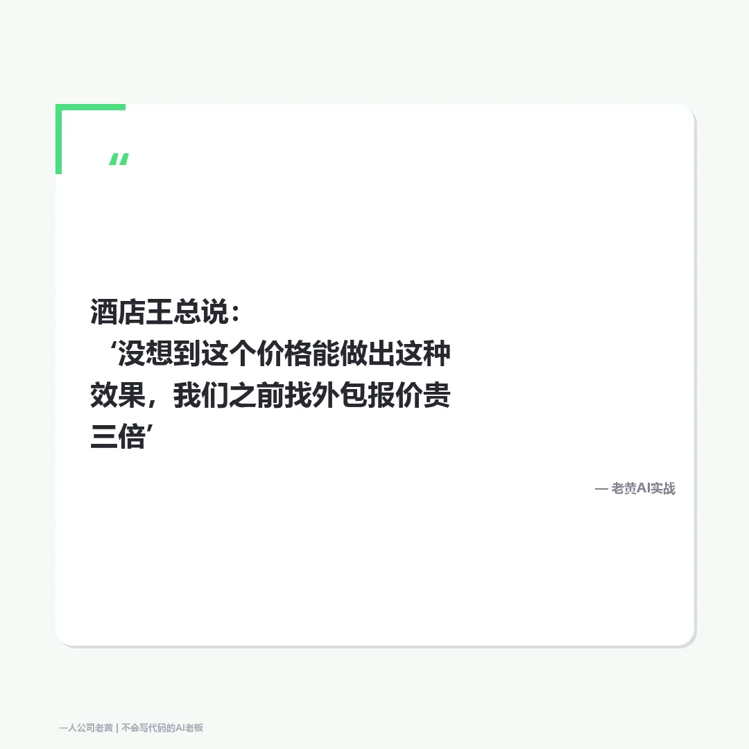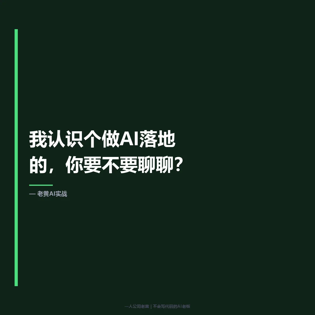 我是老黄,一人公司创始人,帮中小企业做AI工具落地。教培、酒店、旅游、律师——这些行业的老板们找我,不是因为我懂技术,而是因为我懂他们的痛点。