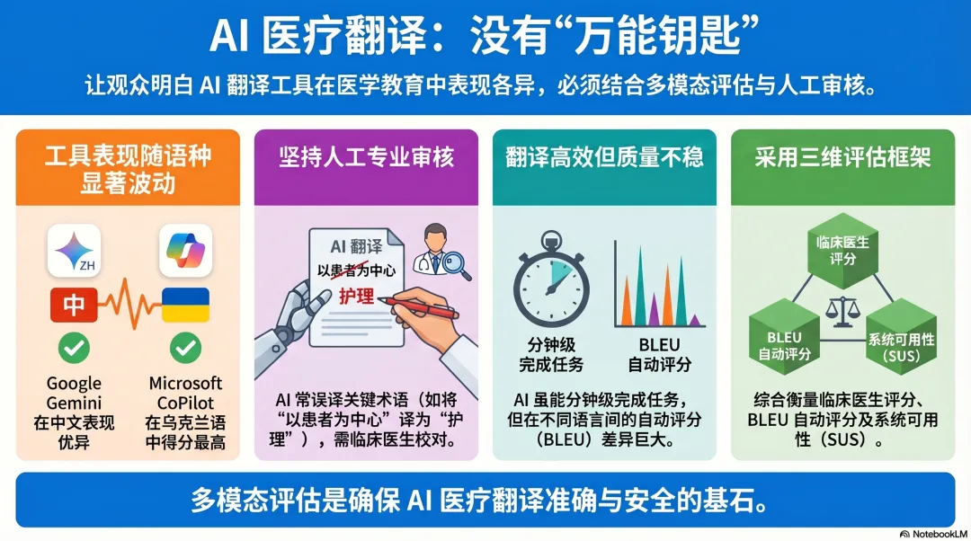 低资源语言的“数据鸿沟”依然是 AI 的软肋。乌克兰语翻译中普遍偏低的评分提醒我们,在非主流语种的重症医疗教育中,过度依赖 AI 可能会带来致命的信息缺失。文献提到的“多模态评估框架”实际上为医疗机构设定了一道防火墙:在将 AI 引入工作流之前,必须经过临床医生的“专业质检”。作为从业者,我们的核心价值正从“原始翻译”向“高阶审校”和“伦理风险管控”转型。