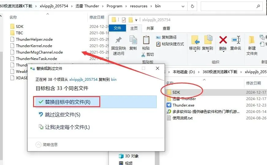 3、将下载文件中的SDK整个文件夹(Thunder\Program\resources\bin\SDK)复制到迅雷11同目录下(Program\resources\bin\SDK),接着将“Thunder.exe”程序复制到(Thunder\Program)目录下进行替换。