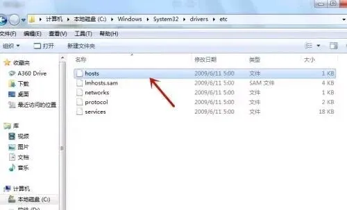 二、通过改hosts文件进入C盘,然后依次选择路径:Windows\System32\drivers\etc\hosts 如下图: