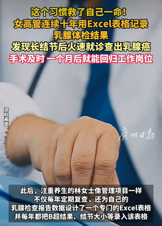 近日,据媒体报道,浙江的林女士(化名)今年54岁,因为一个曾坚持了十年的习惯——用Excel表格记录每一次乳腺检查数据,让她及时发现、确诊了乳腺癌,并实现了早手术、早康复。