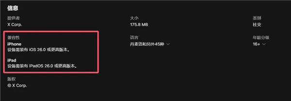 XChat为独立iOS应用,安装包大小约171.8MB 至175.8MB,运行要求为iOS 16.0及以上系统,应用适用年龄为17岁及以上用户,安卓版本目前尚未公布具体上线时间。