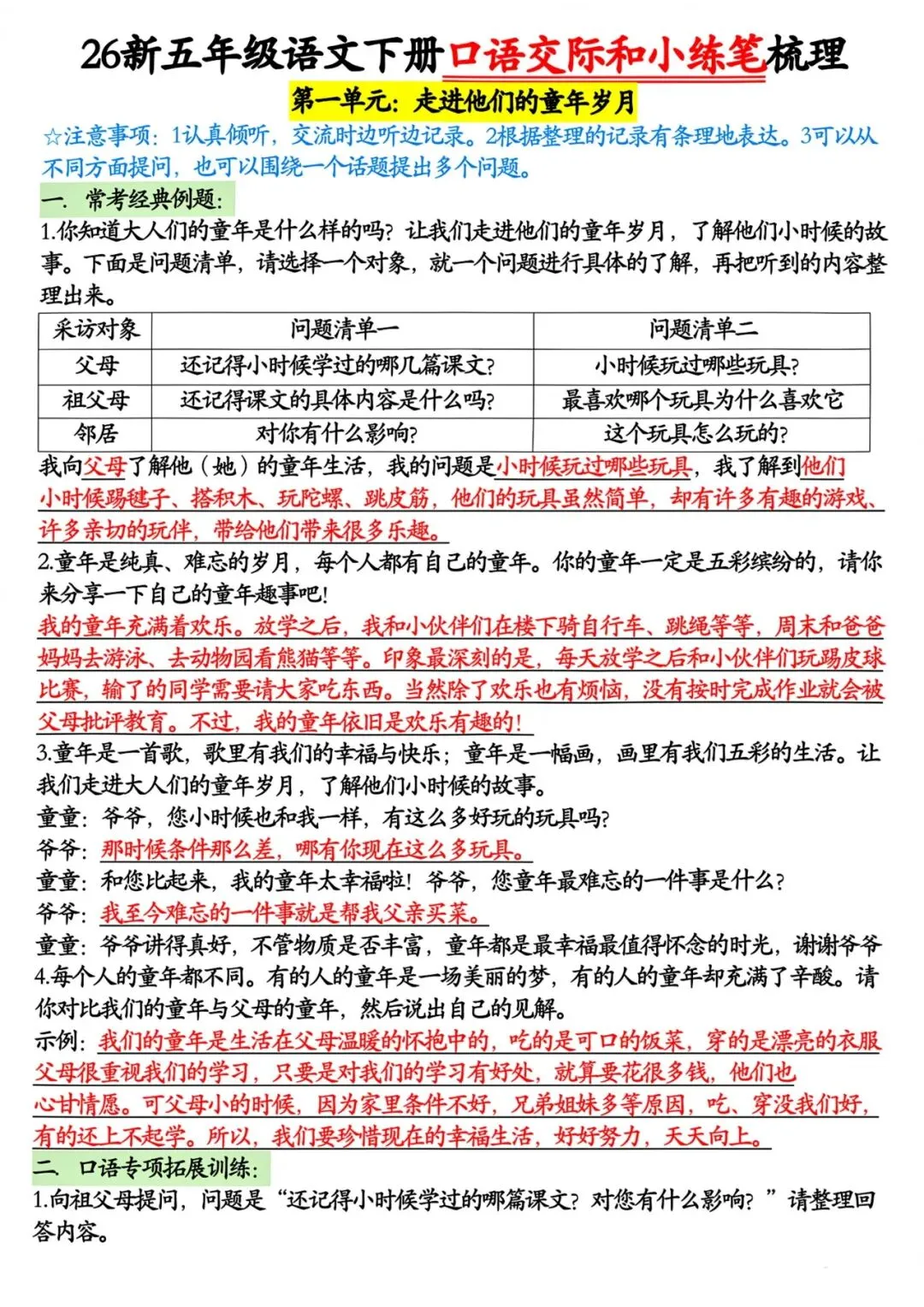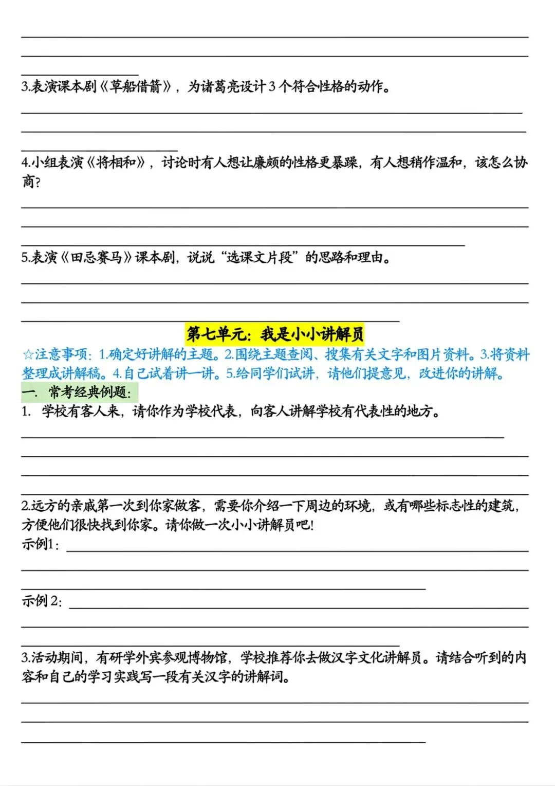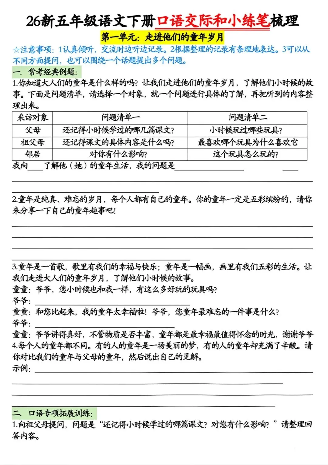 五年级下册语文口语交际和小练笔梳理丨可打印