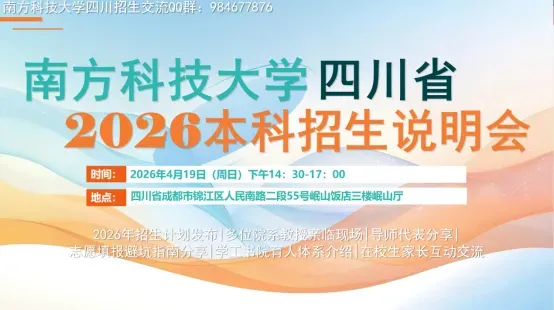 为帮助广大考生和家长了解南科大办学特色和综合评价招生政策,南科大四川招生组定于2026年4月15日、16日、19日分别在绵阳、南充、成都举行招生见面会。欢迎来现场与南科大招生组老师、优秀川籍学生及家长代表一起交流,详细了解不一样的南科大!