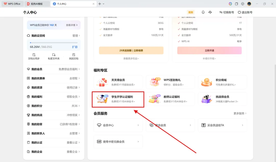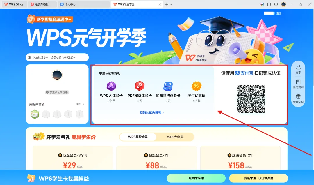 福利推荐–学生专享福利WPS学生专区支付宝学生认证领好礼 1、WPS 2、点击头像–进入“个人中心” 3、“福利专区”–“学生开学认证福利”–进入“WPS学生专区” 4、“WPS学生专区”–“学生认证领好礼”-支付宝扫码认证 WPS AI体验卡3个月 PDF权益体验卡3天 拍照扫描体验卡3天 学生优惠价办理会员权益