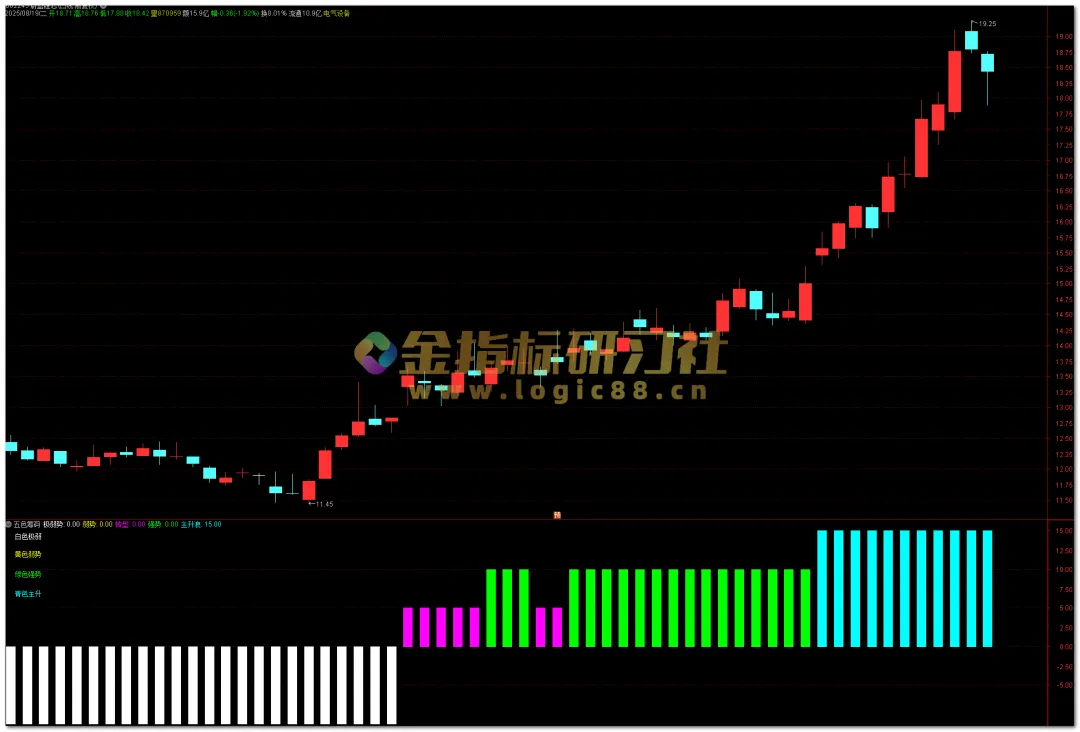 场景A:波段低吸潜伏 条件:股价经历下跌后,副图长期处于水下的白色/黄色柱。某一天,柱体突然翻上零轴,打出第一根洋红色“转型”柱。 操作:这叫资金破冰。这时候不要急着满仓,拿底仓去试探。如果随后几天大盘回调,但它的柱体依然坚挺在洋红或绿色,说明主力护盘意愿极强,果断逢低加仓!