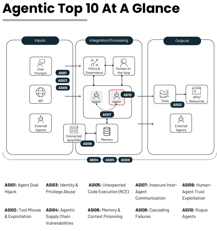 OWASP在2025年底发布了”智能体应用十大安全风险”(2026版),由100多位安全研究人员编写,NIST和欧盟委员会做了同行评审。