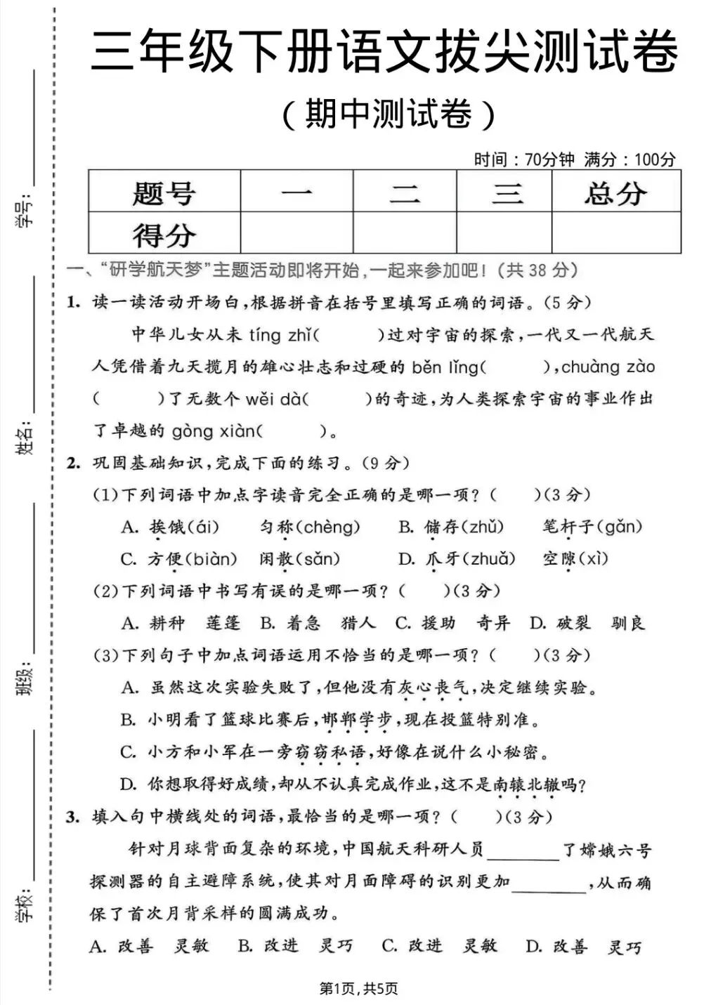 三年级下册语文《期中拔尖测试卷》多套 电子版可下载打印