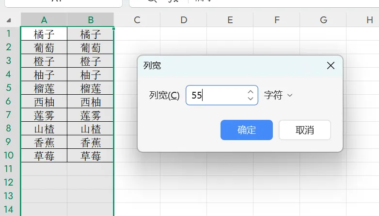 选中A:B列,设置列宽为55