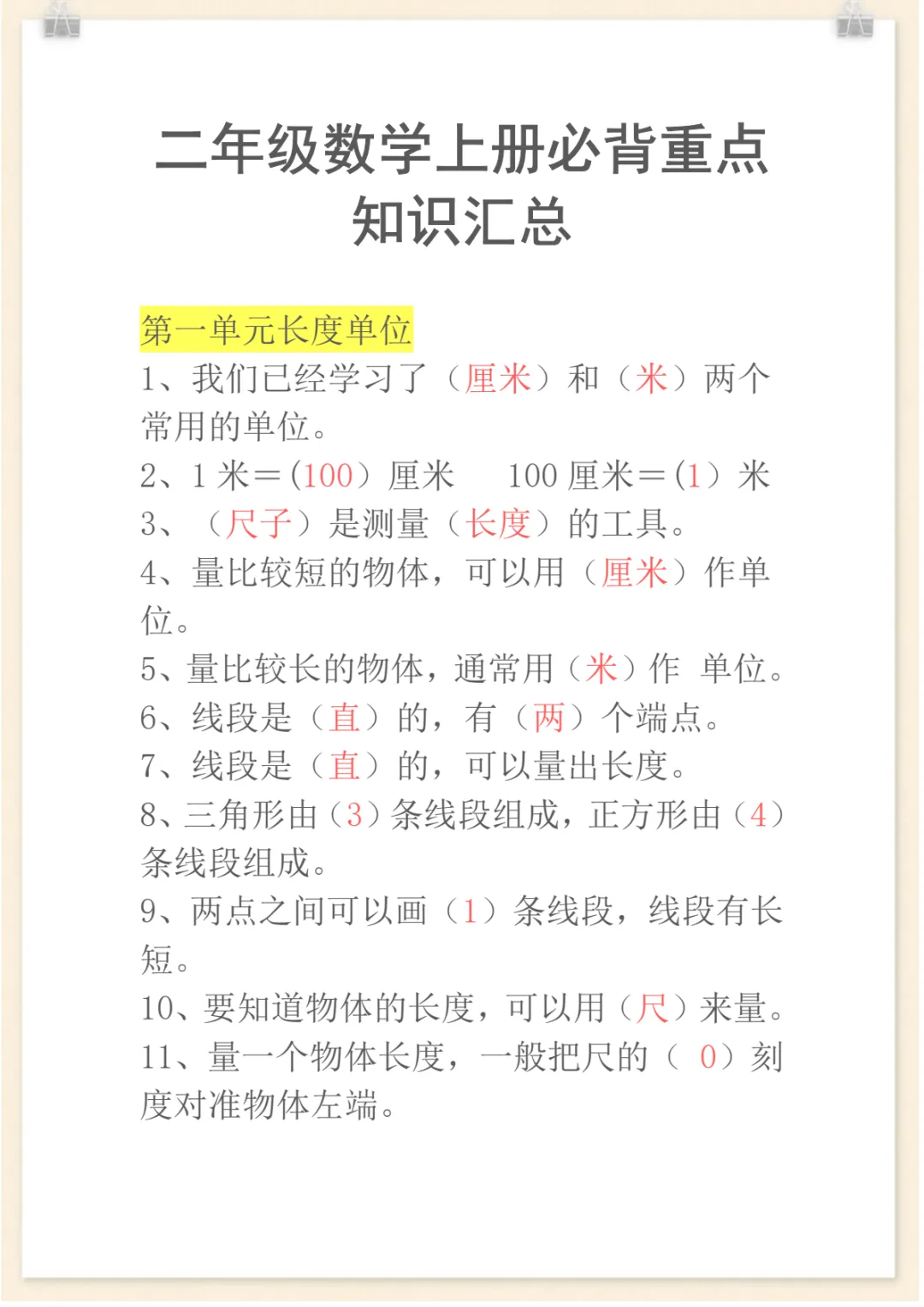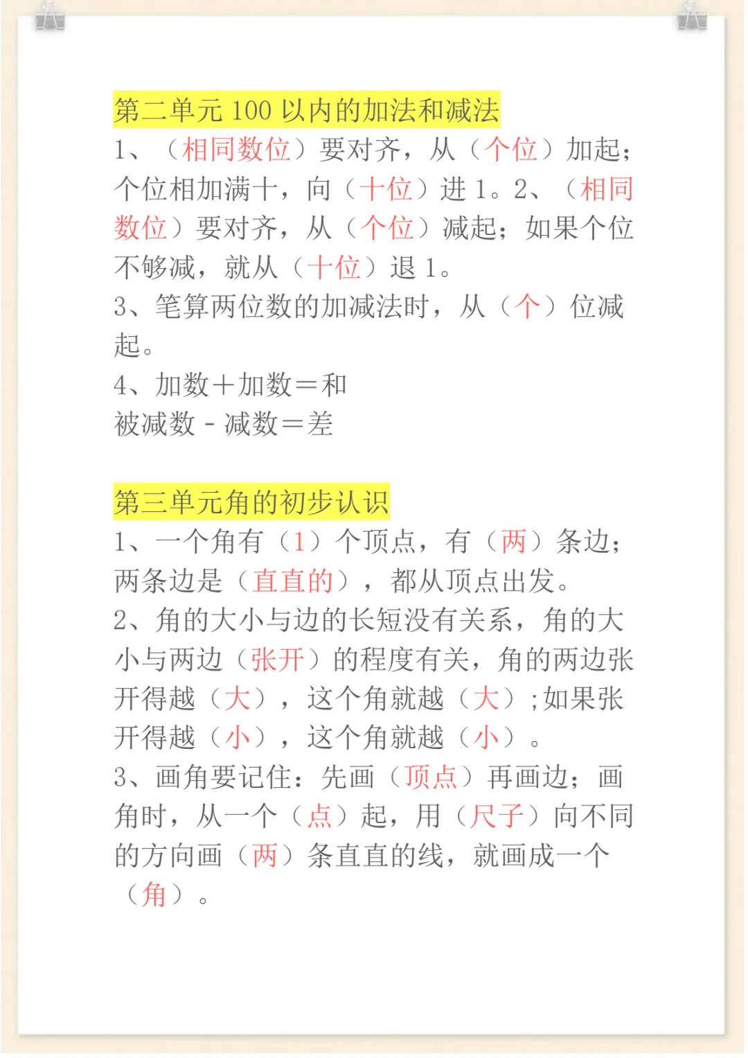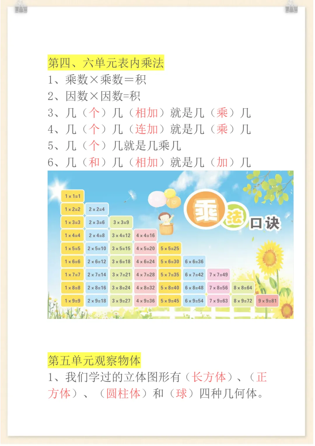 二年级上册数学必背知识汇总,电子版可打印