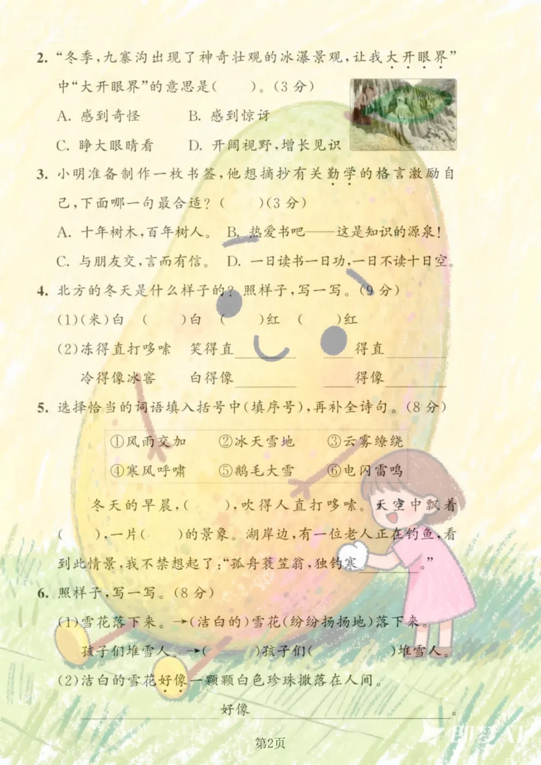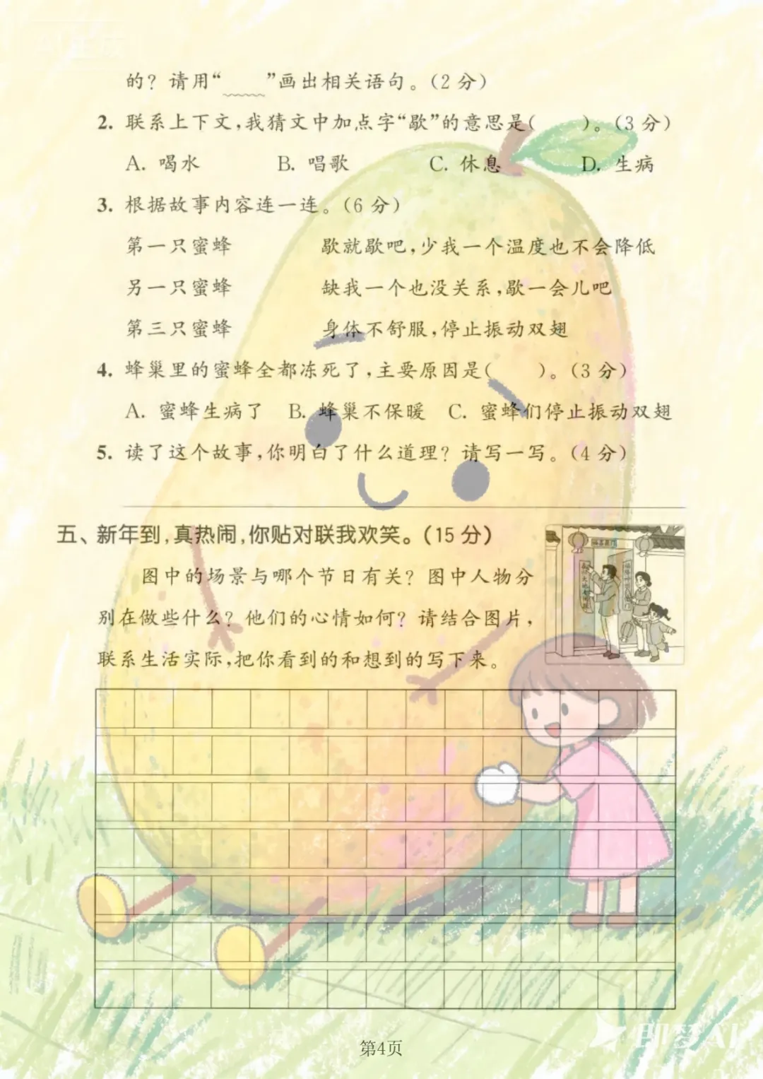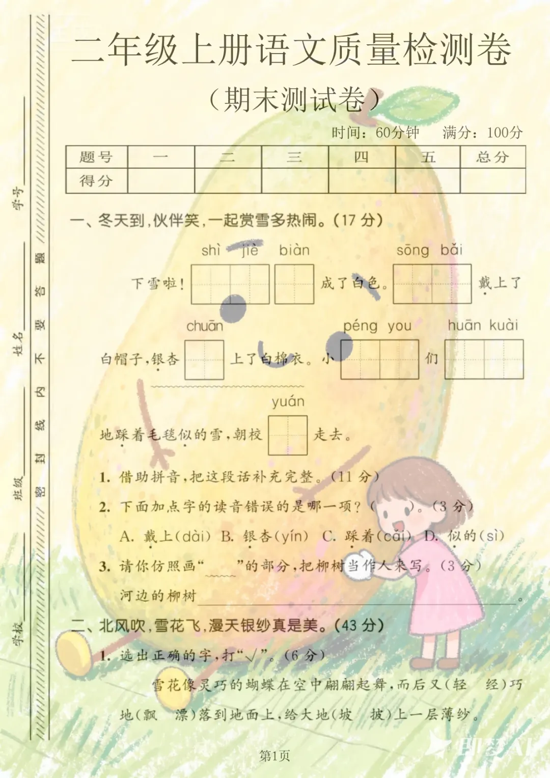 二年级上语文期末质量检测卷1,共5页,电子版可下载可打印,这份期末质量检测卷紧扣二年级上册语文学习内容,涵盖多个核心知识点与专项训练内容,适合孩子在期末阶段进行系统自测与查漏补缺,帮助家长更清楚地了解孩子对本学期所学内容的掌握情况。需要的家长可以及时下载打印出来,让孩子练一练,更有针对性地做好期末复习。