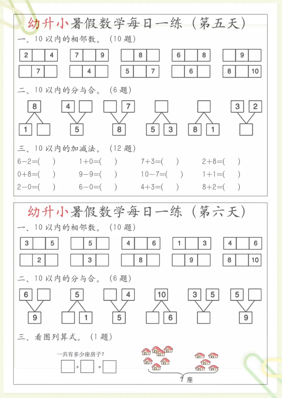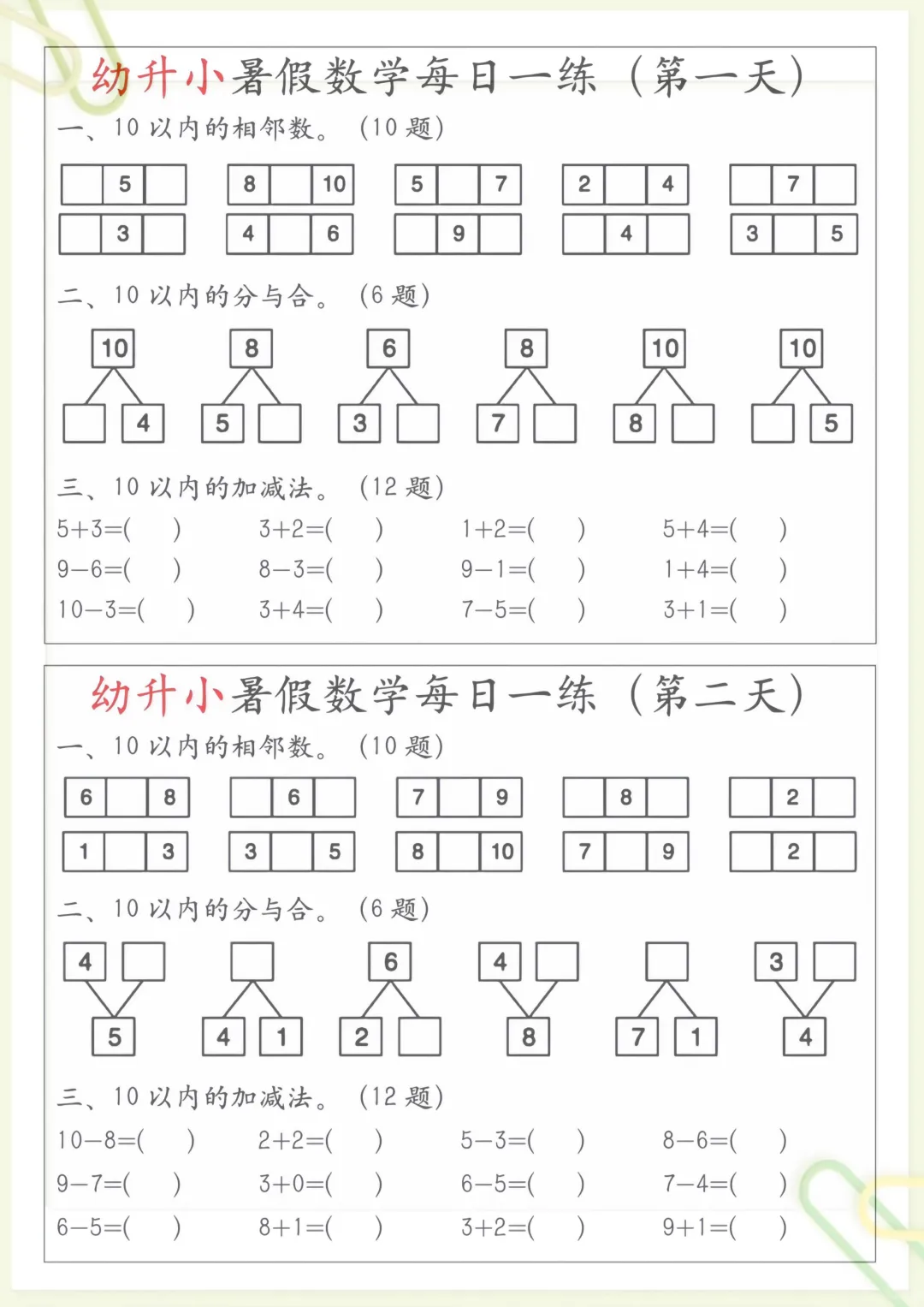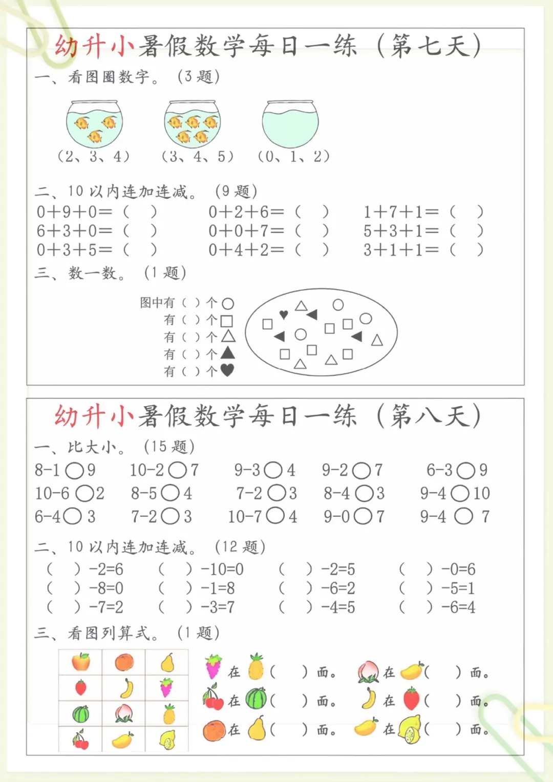 幼升小暑假数学每日一练(1),共4页,电子版可下载可打印,这份幼小衔接数学练习资料围绕入学前数学启蒙与基础训练设计,涵盖多个核心知识点与专项训练内容,适合孩子在暑假期间进行每日巩固练习,帮助家长循序渐进地带孩子打好数学基础、提升学习衔接能力。需要的家长可以赶紧下载打印出来,让孩子练一练。
