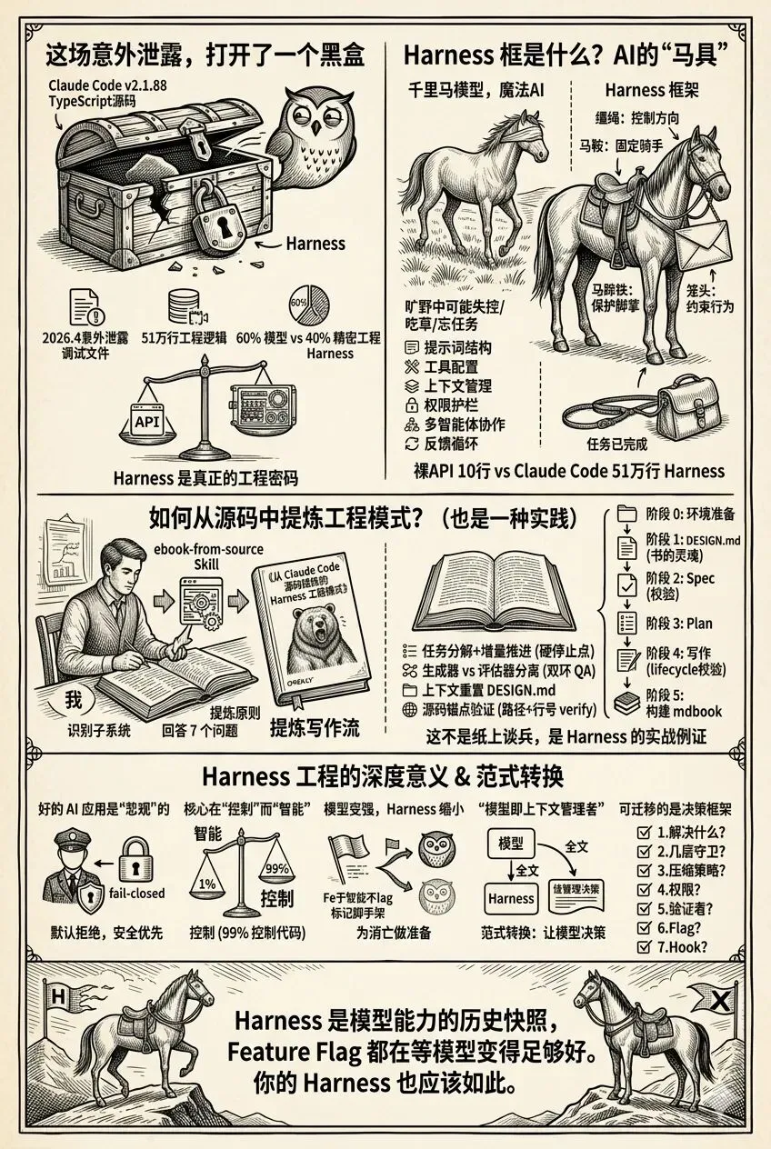 Anthropic 因工程失误意外泄露了 Claude Code 约 60%~70% 的源码。我花了两周开发了一个名为 ebook-from-source 的 skill ,从中提炼出 Agent Harness 工程设计的核心原则,并指导 AI 写了一本书——《从 Claude Code 源码提炼的 Harness 工程模式》。