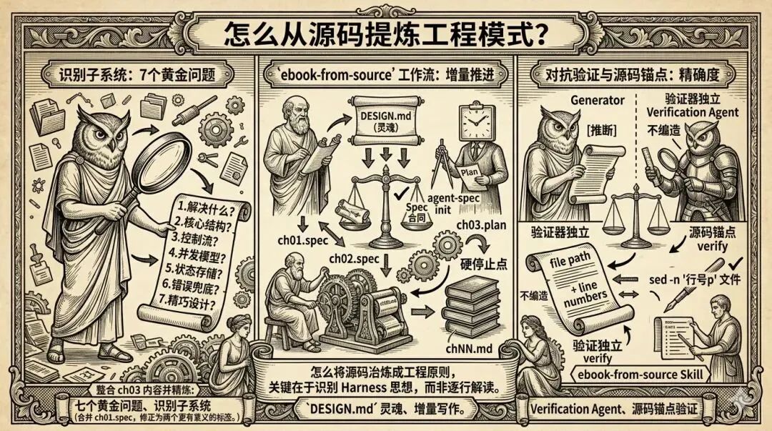 驱动整个写作流程的是一个名为ebook-from-source的 Skill,它背后的 Harness 工程实践体现了五大核心模式。