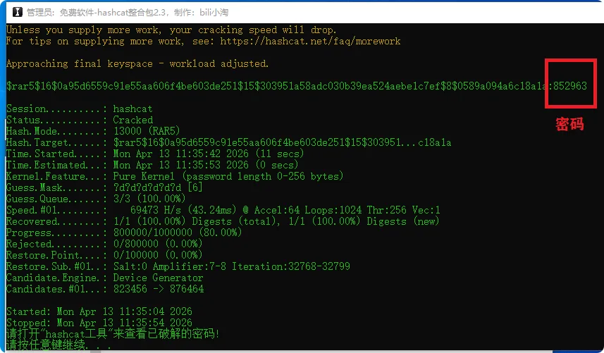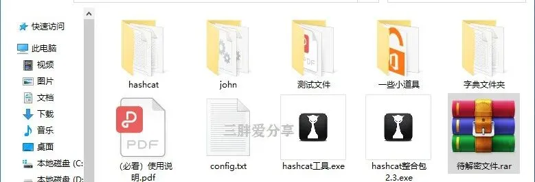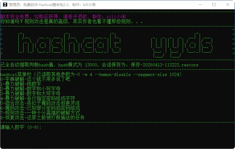 它就是hashcat,号称密码破解天花板,它的原理就是猜密码,特点是速度快,支持显卡解密,比普通解密软件快100倍以上,支持各种压缩包、文档、PDF等文件的解密.不要安装解压即用,解压运行hashcat整合包.exe文件,第一次运行会弹出作者的视频教程地址,大家可以看看,文件夹里也有详细的使用说明书讲的很详细。