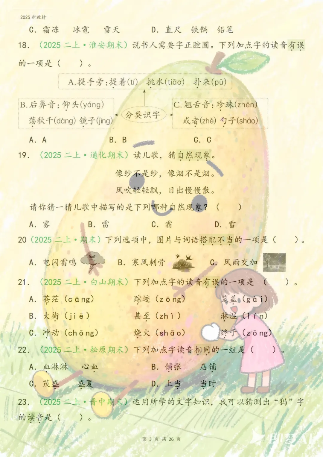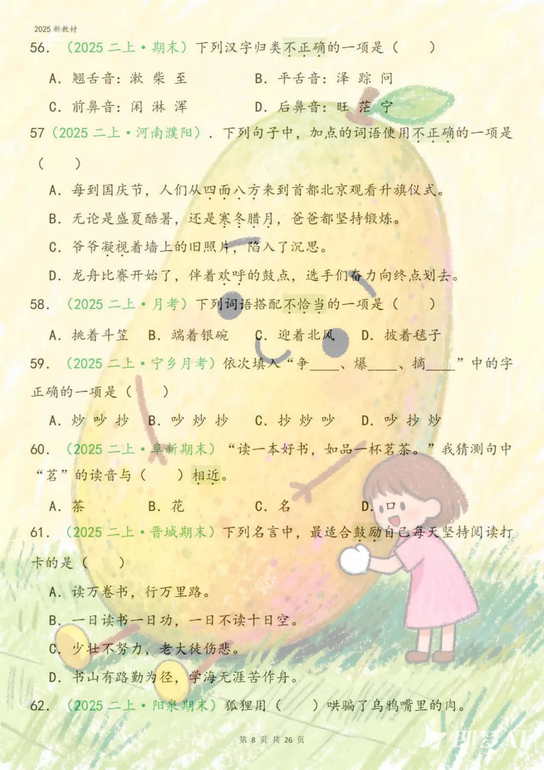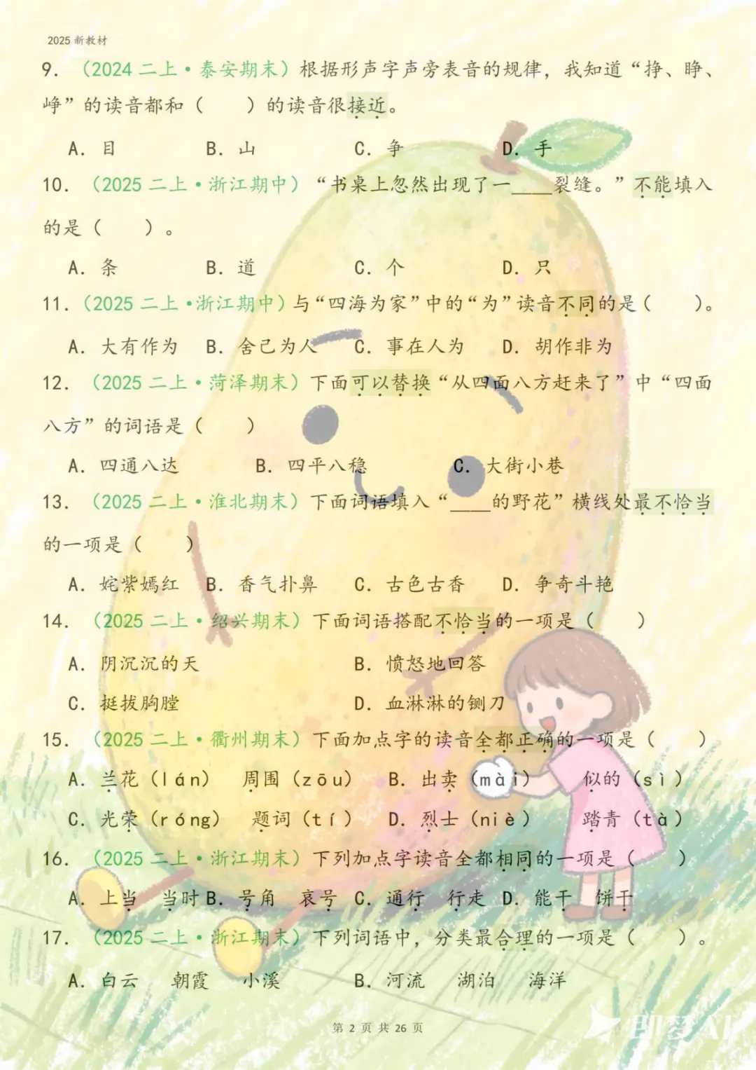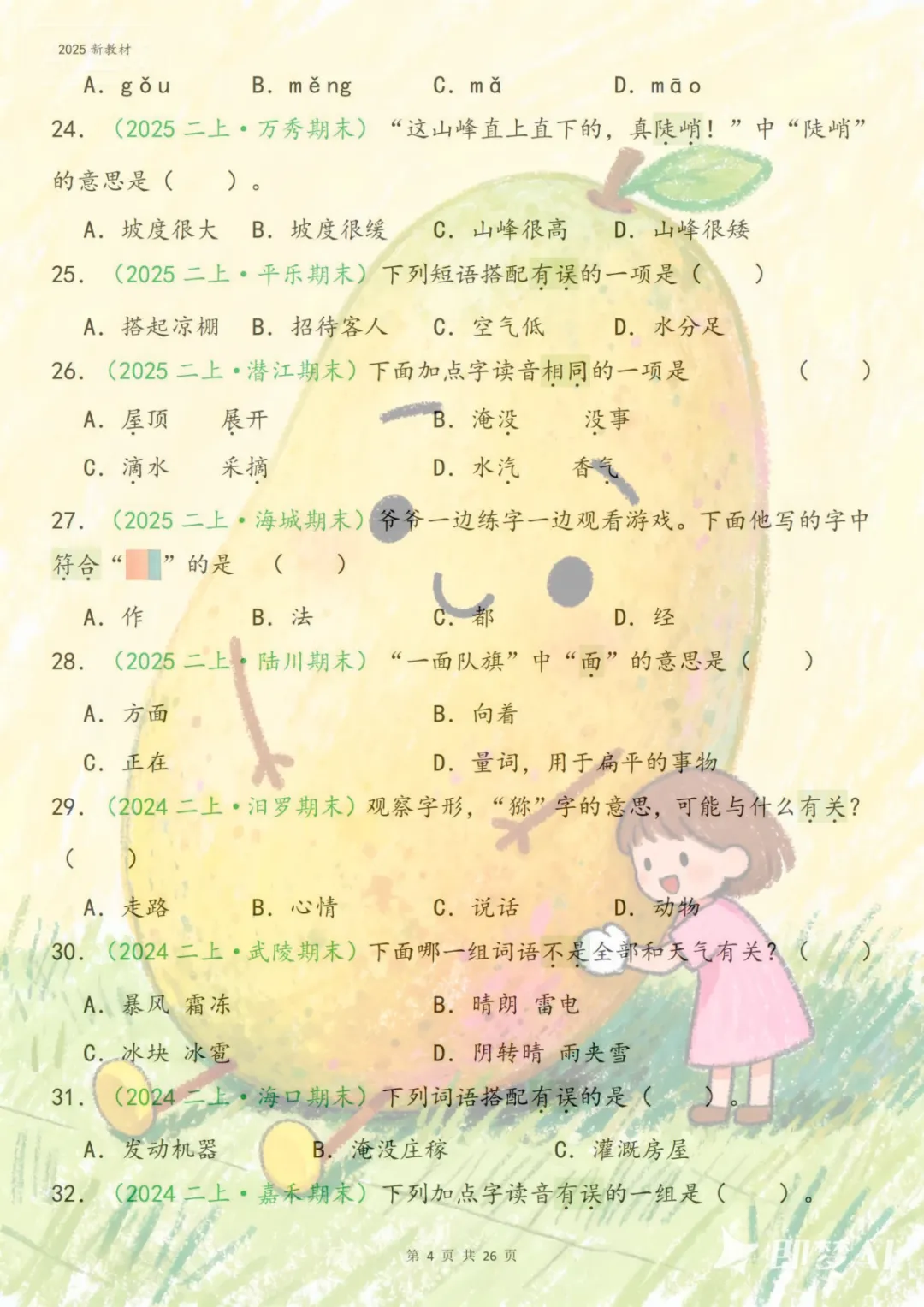 二年级上语文期末字词选择,共26页,电子版可下载可打印,这份资料紧扣二年级上册语文期末复习需求,围绕字词选择这一重点内容进行专项训练,帮助孩子在练习中巩固易错字、常见词语辨析等基础知识,进一步提升识字用词能力,为期末复习打好基础。内容实用,适合家长提前下载打印出来,让孩子在家系统练一练。